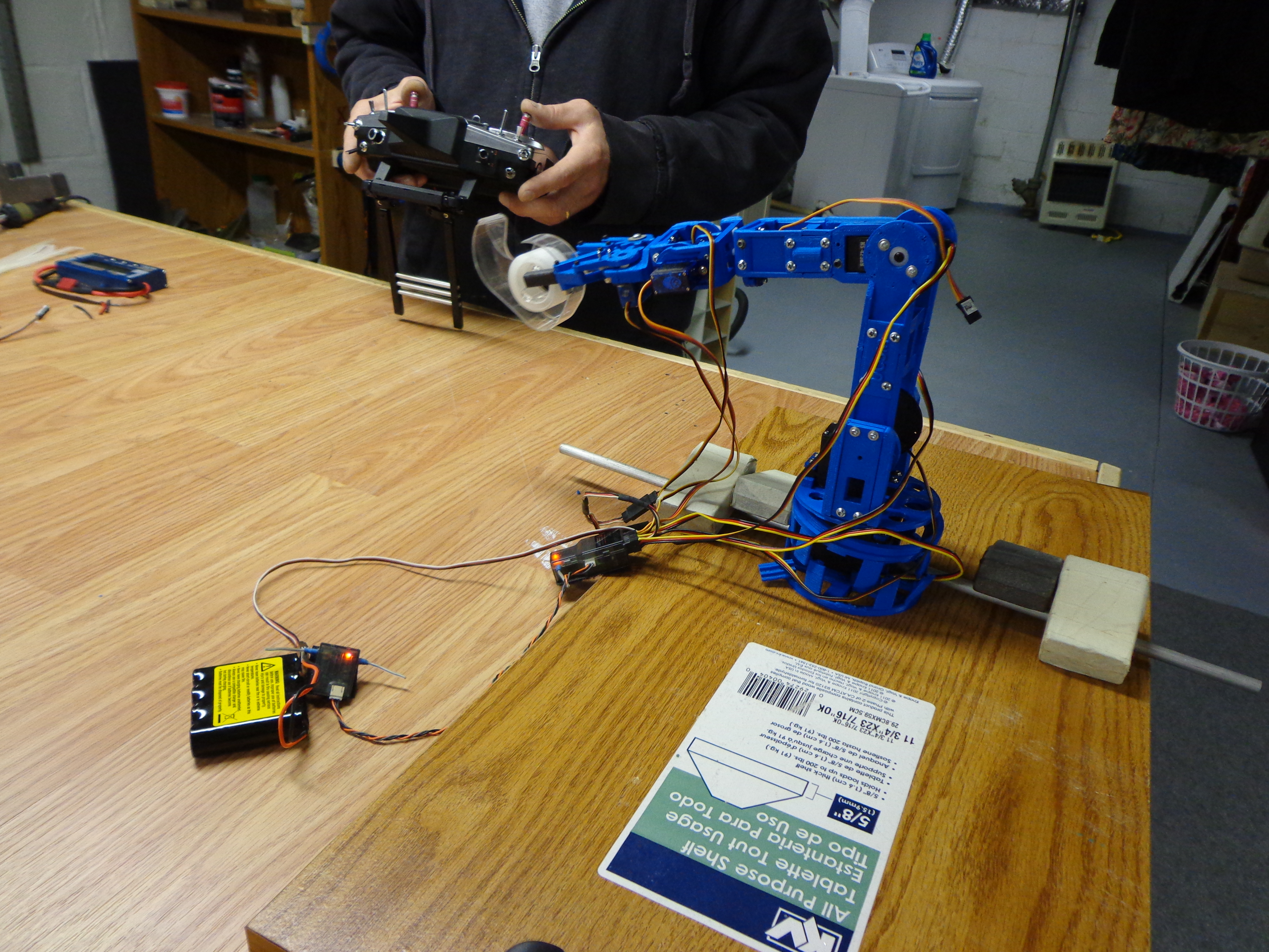 He originally bound the arm to his DX18 that he uses for flying his RC air craft. Currently Jay is teaching himself how to code an Arduino board so that he can eventually program the arm to move in a certain pattern when a key on the computer keyboard is pressed.