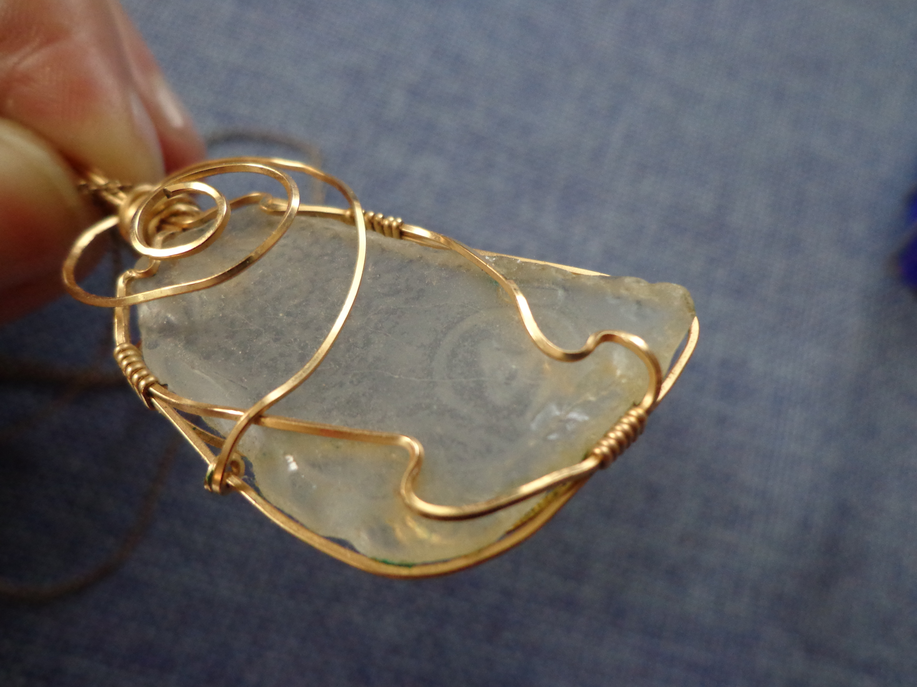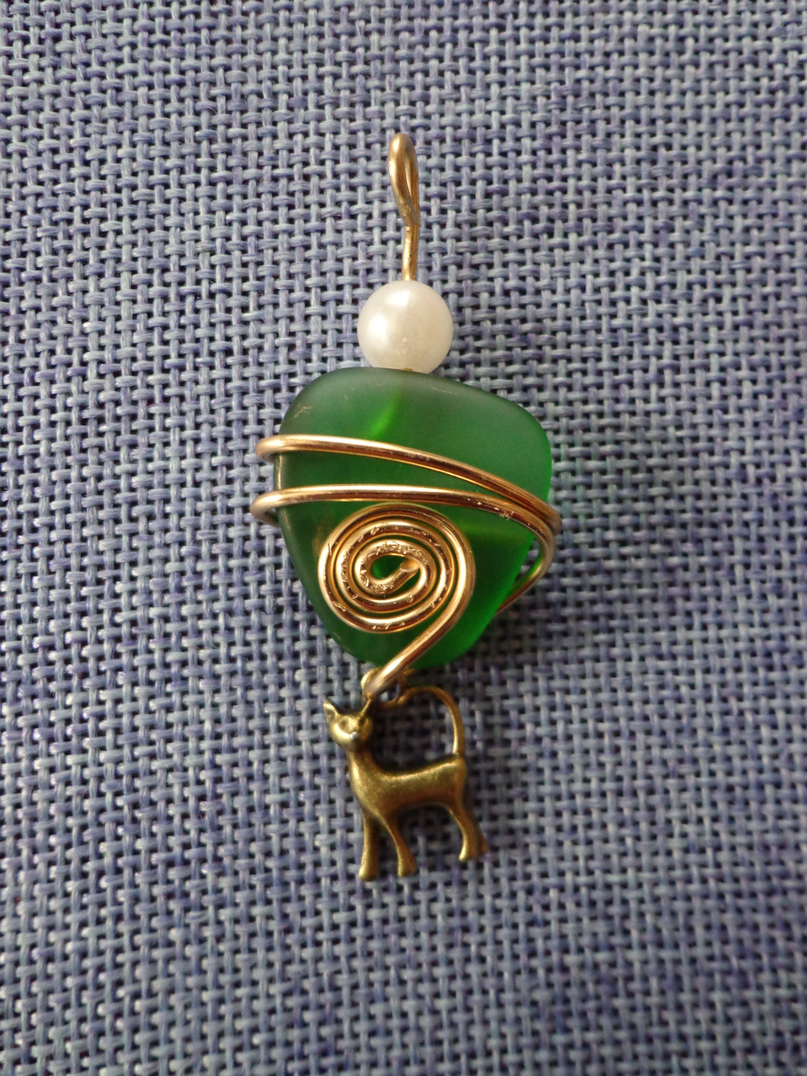 After we were done with our practice pendants we were allowed to pick two pieces of real beach glass. This was glass that our instructor had found herself. She had a tray of glass that had been tumbled, and a tray that had just been cleaned up and not tumbled. For a change of pace I chose a green pieces of glass, but my other piece I chose was blue. I don’t have a picture of the blue piece because I hung it in Jay’s car and it has stayed there.