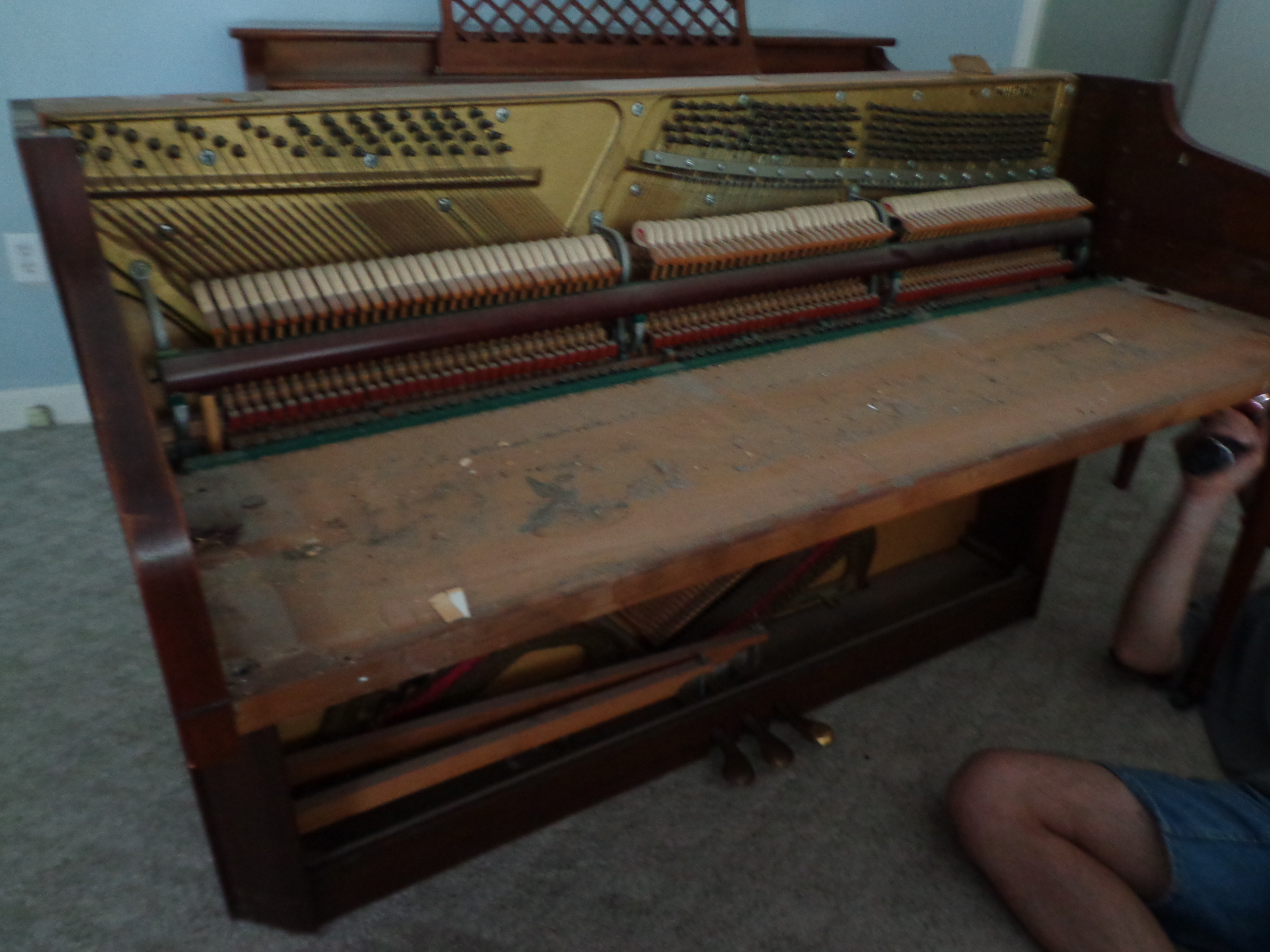 It was decided that while Jay was on shutdown he would get some guys together and move the piano. Karen only lives three houses away from us, so it wasn’t going to be a huge ordeal. I was worried, though, as I didn’t want Jay to hurt his back by moving the piano. The other consideration was: What to do with the old piano. I didn’t want to sell it because it takes forever for anybody to even want one (I had tried that at one point when I lived on my own). Also, I didn’t want to stick a young student with a piano that had a broken string that couldn’t be fixed and also wouldn’t hold a tune for long. I told Jay that the better thing would be to take it apart, scrap what we can, use as much of it as possible, and then let my dad burn the rest at the campfires he has during hunting season.