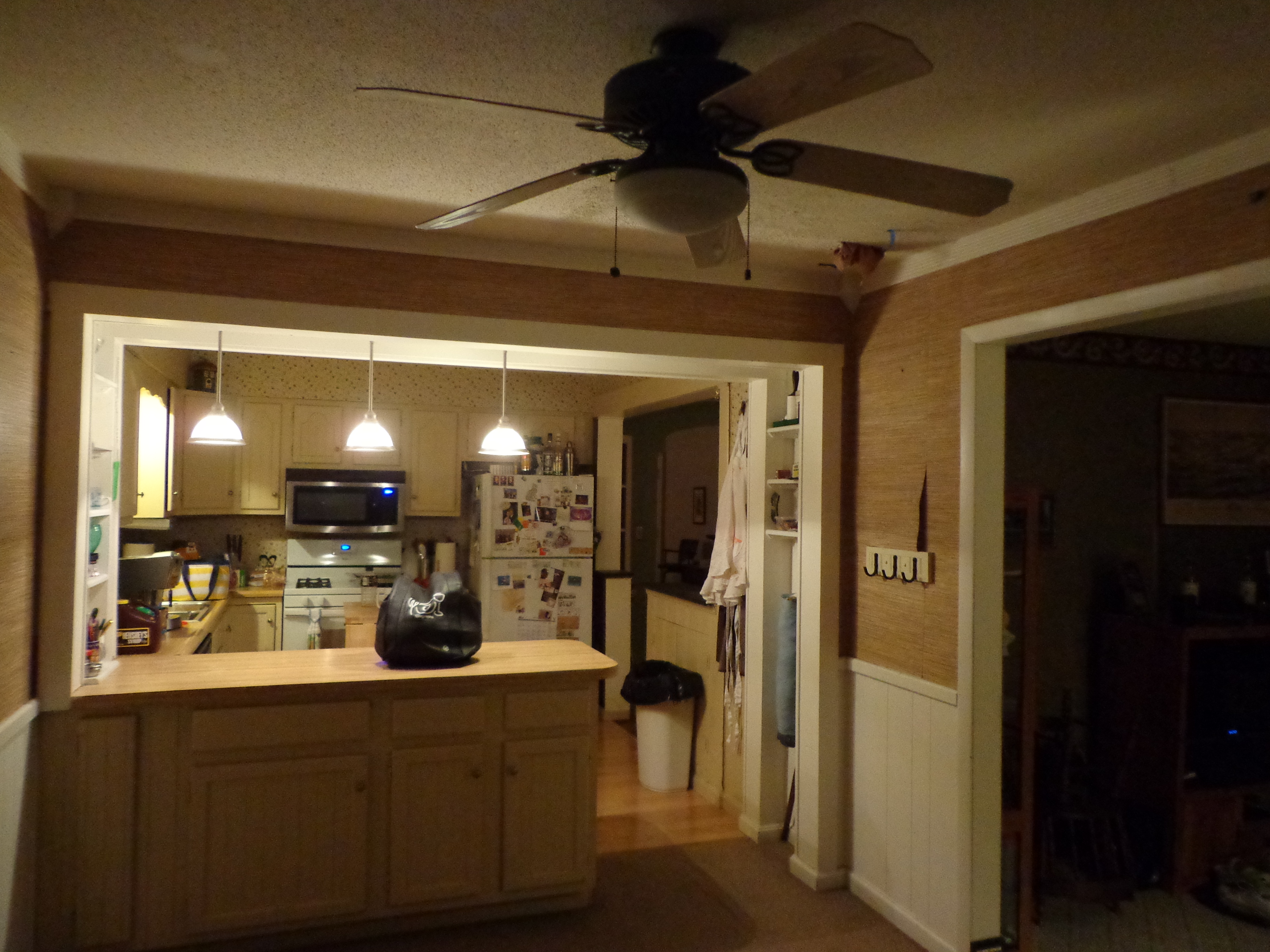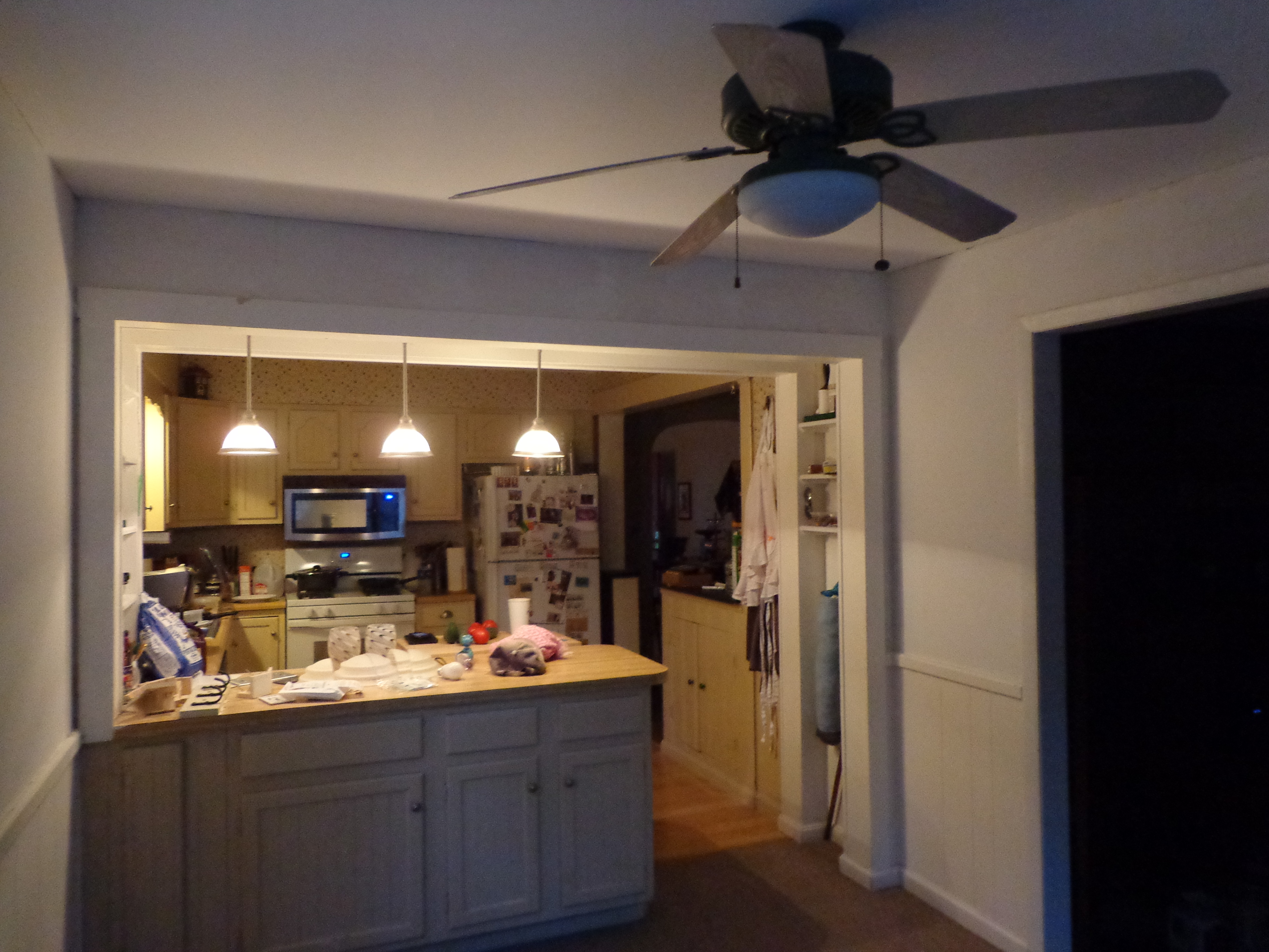 The only thing left to do in this room is to get some new shelves for the inset shelving (it goes to the right of the airplane). The old ones were wood and very unevenly cut. I mentioned that I thought some frosted glass shelves would look really nice in there. They would go with the frosted glass light fixtures that hang over that counter. We also have to get the molding put up. Other than that, this room is finished. And no more nasty wall paper or patched ceiling! Hopefully this winter we will notice a big difference in the temperature in the family room now that there’s actually insulation in the ceiling.