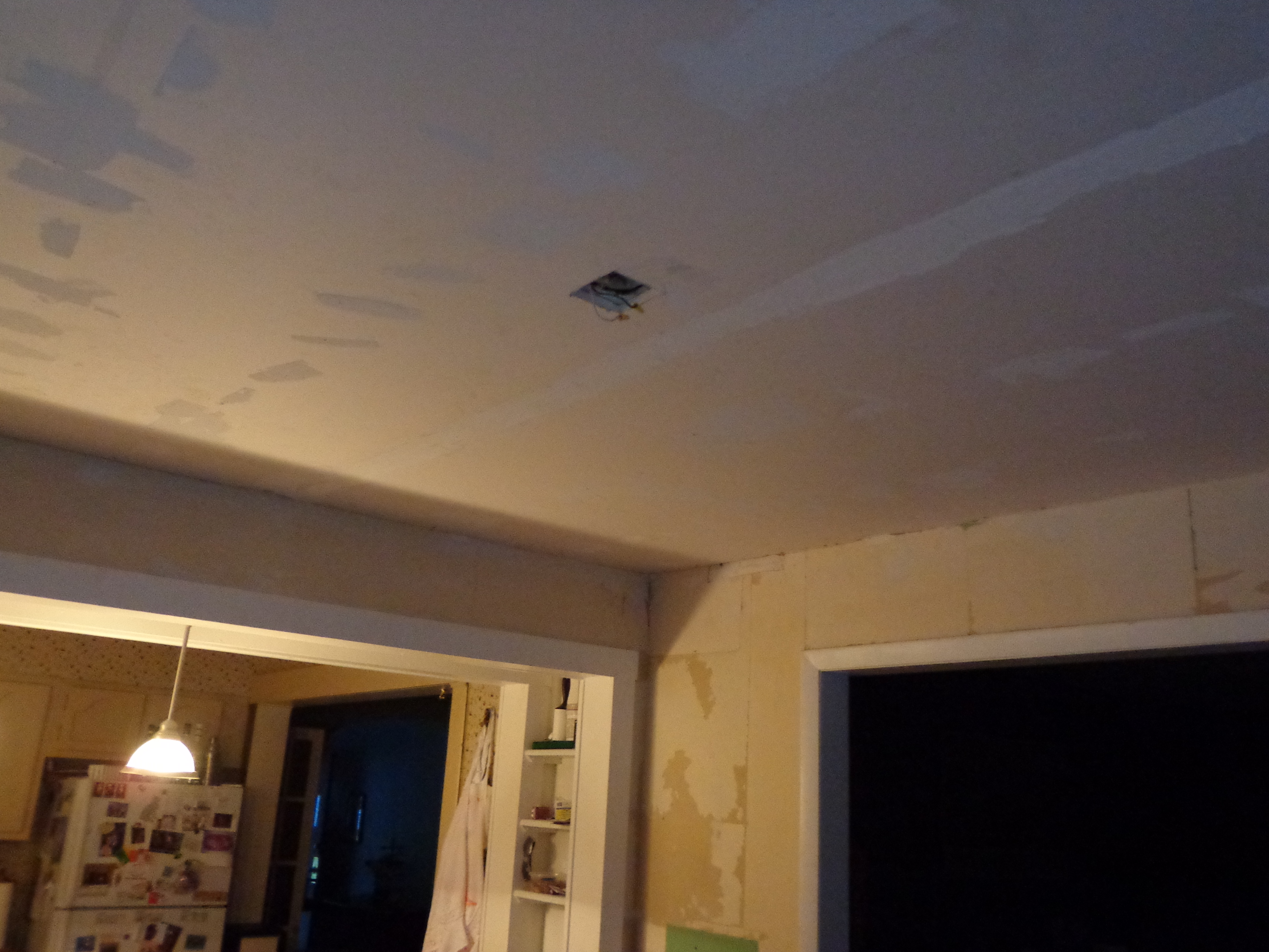 This past winter we’d had a MAJOR leak in our dining room and had to call in a repair person the Monday before Christmas. We lived with this rag until last month. I didn’t want to do anything with it until we were fixing the rest of the ceiling. As you can see, it had been patched at least once in the past. We figured that when we had the insulation put in that we would have the contractor replace this ceiling at the same time.