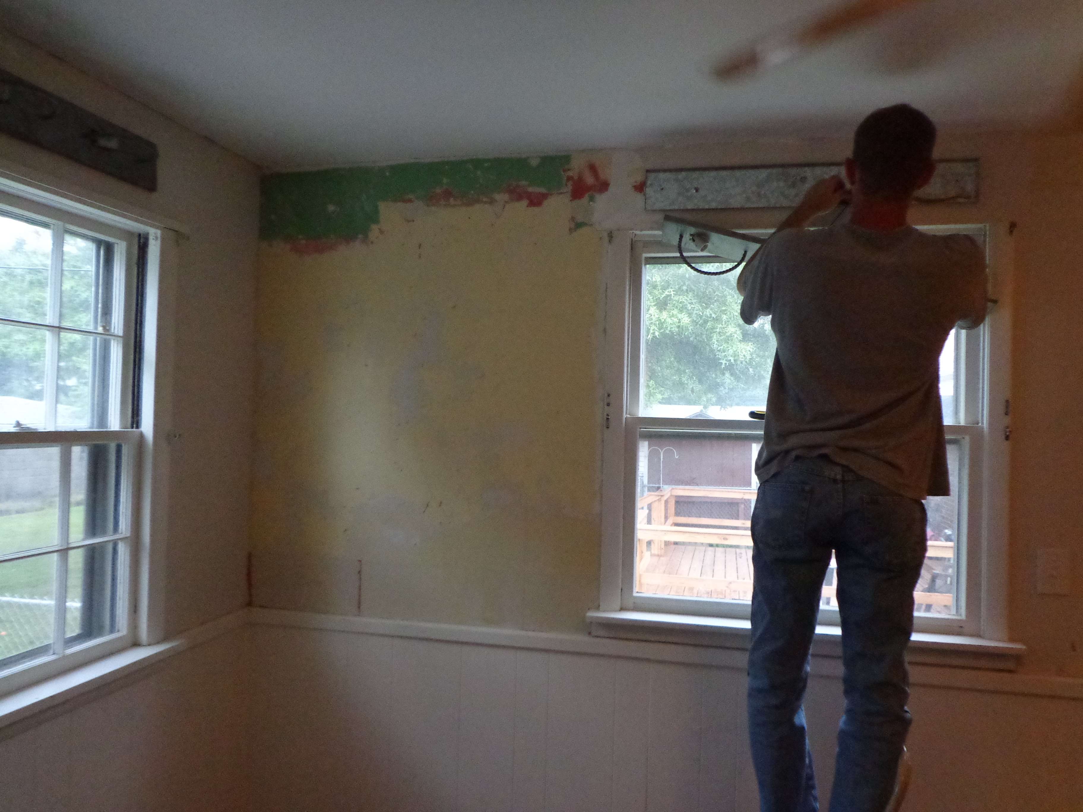 I believe there were at least four layers of paint on these walls, plus the top layer of wall paper. Jay helped me to put joint compound on the walls to smooth it out (I tried sanding it off, but that didn’t work). Then I smoothed out the dried compound as best as I could before priming it.