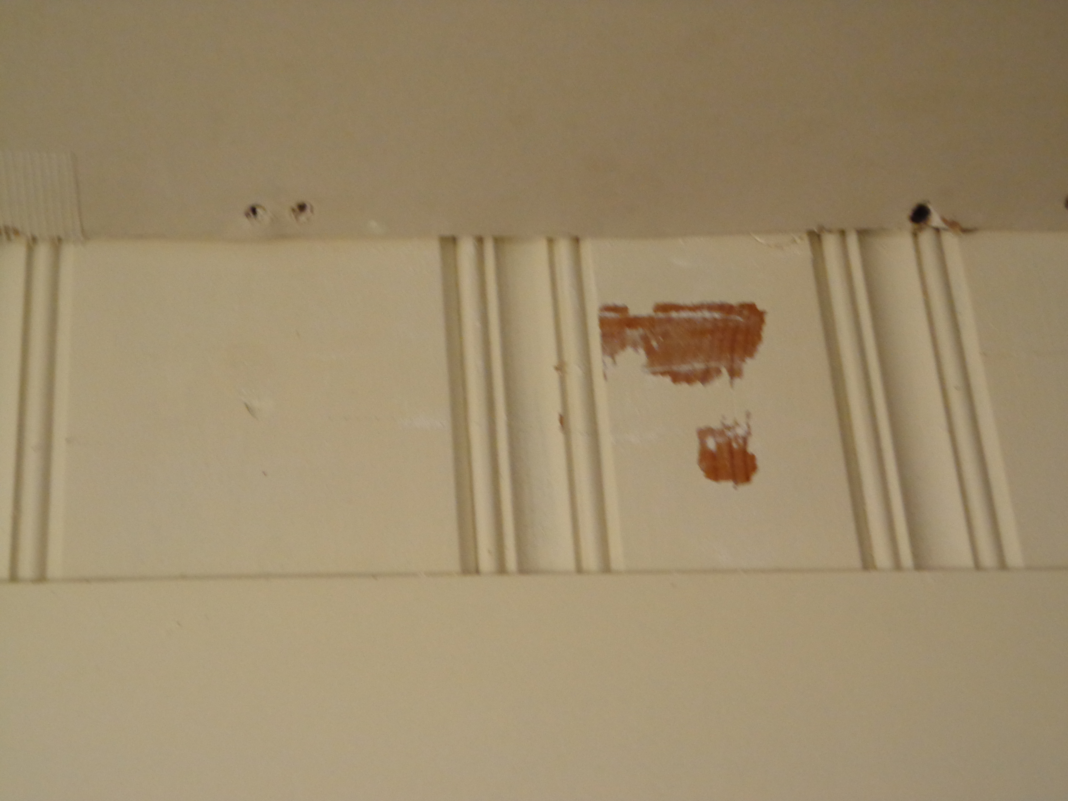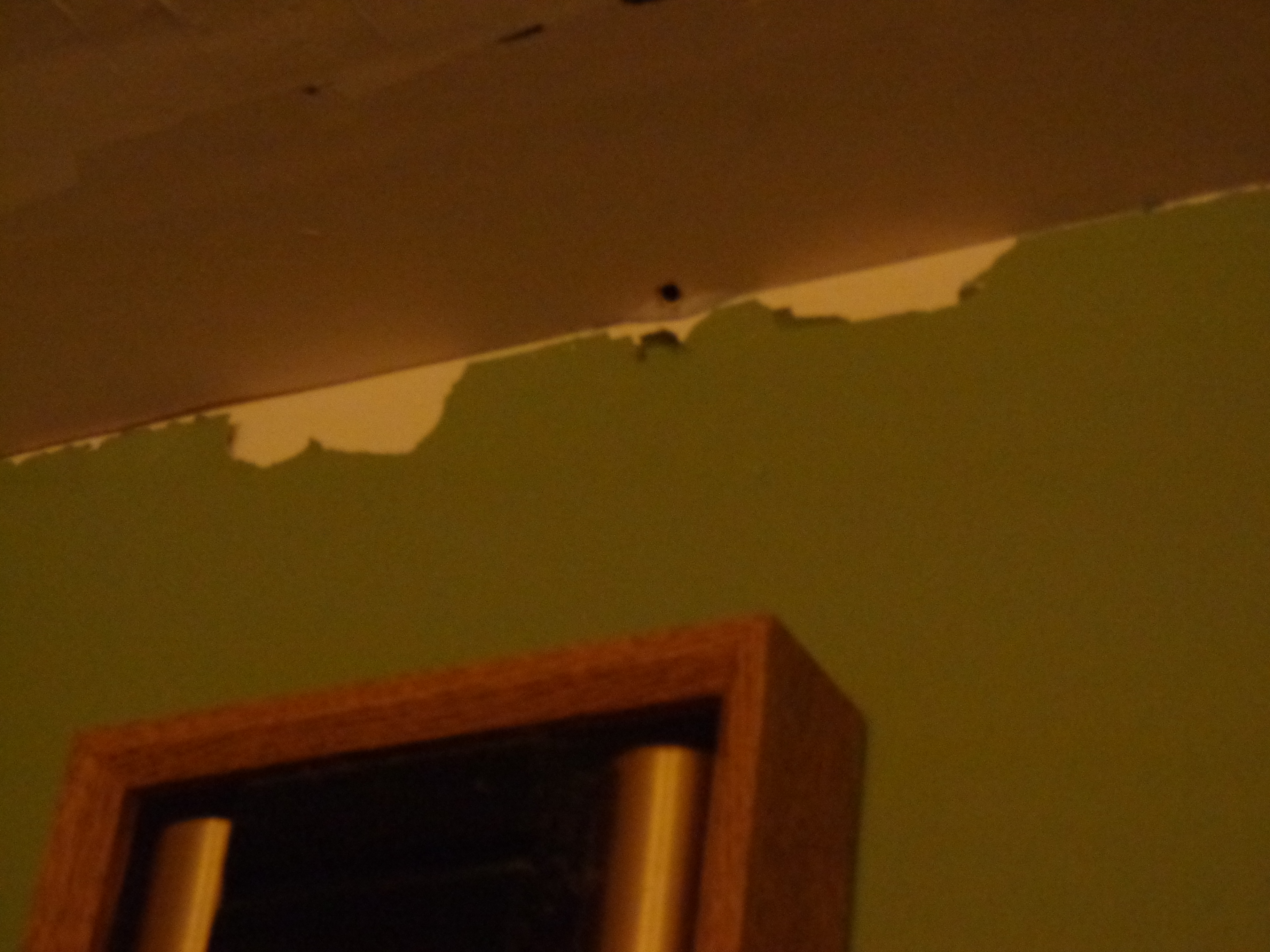 They did not do such a good job, however, when putting the drywall up. To be fair, I don’t believe that this damage was their fault. This happened when they were taking the molding down so that they could replace the ceiling. The previous owners didn’t feel that you needed to tape anything off when painting, or even remove molding. So I have a feeling that some of the paint for the wall ended up on the molding and thus it pulled away with the molding.