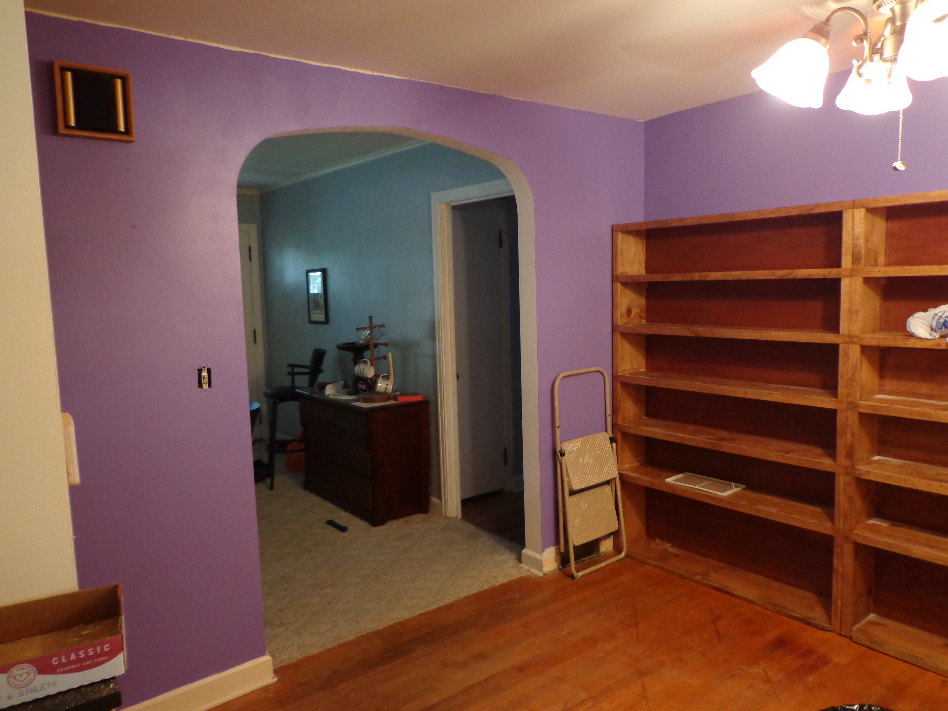 In the meantime I emptied the bookshelves so that we could move them away from the wall. I asked Jay what color he wanted in here, and we compromised on a shade of that color. I didn’t want that dark green to show through, so I had to prime the walls first.