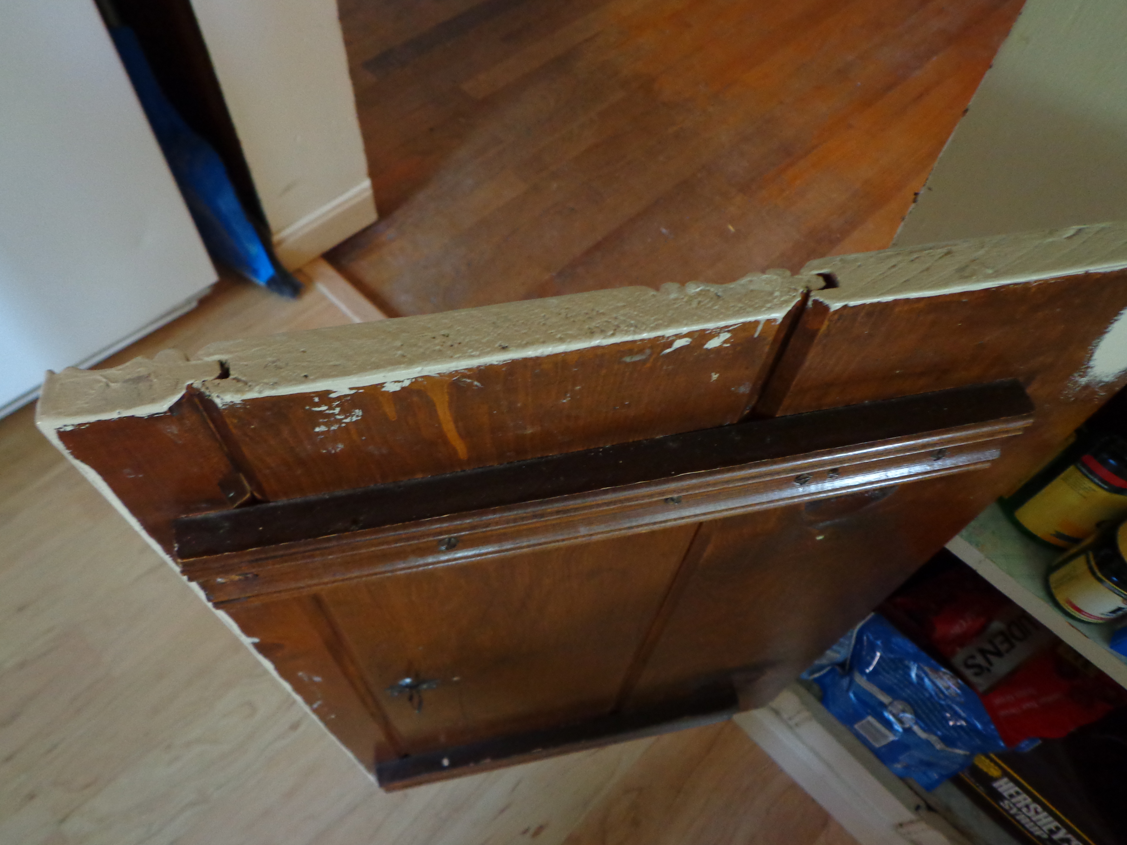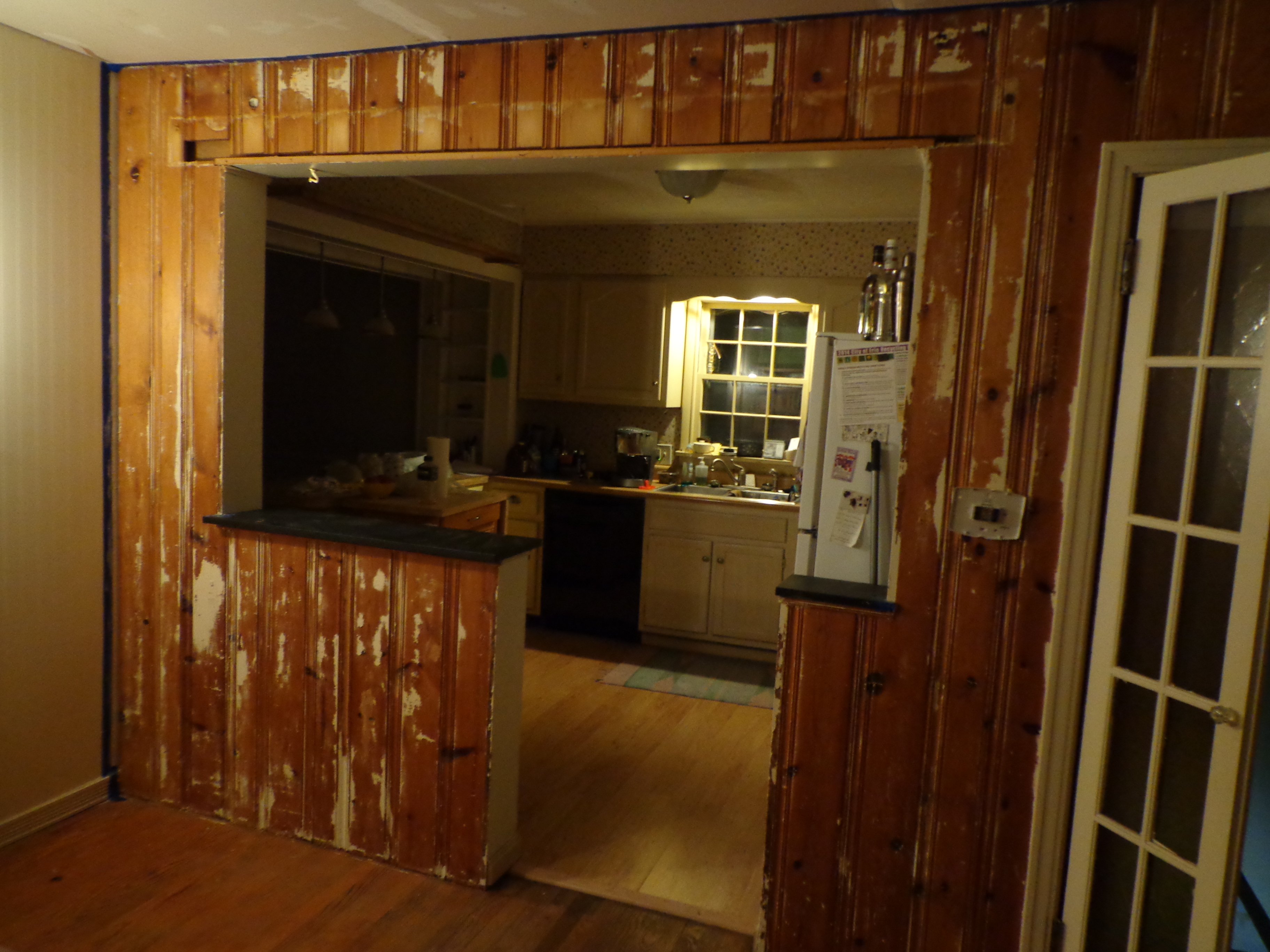 They also marred the paint on the wall between the kitchen and the library. I hadn’t planned on repainting the library, but it looked like I wasn’t going to have a choice. Jay and I were discussing this when we noticed that it was real wood underneath this paint.