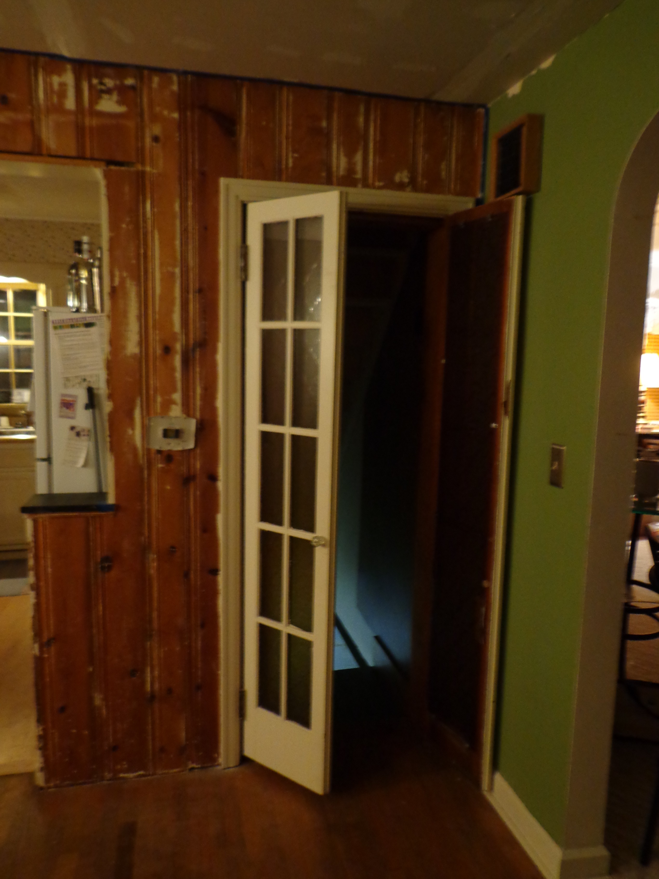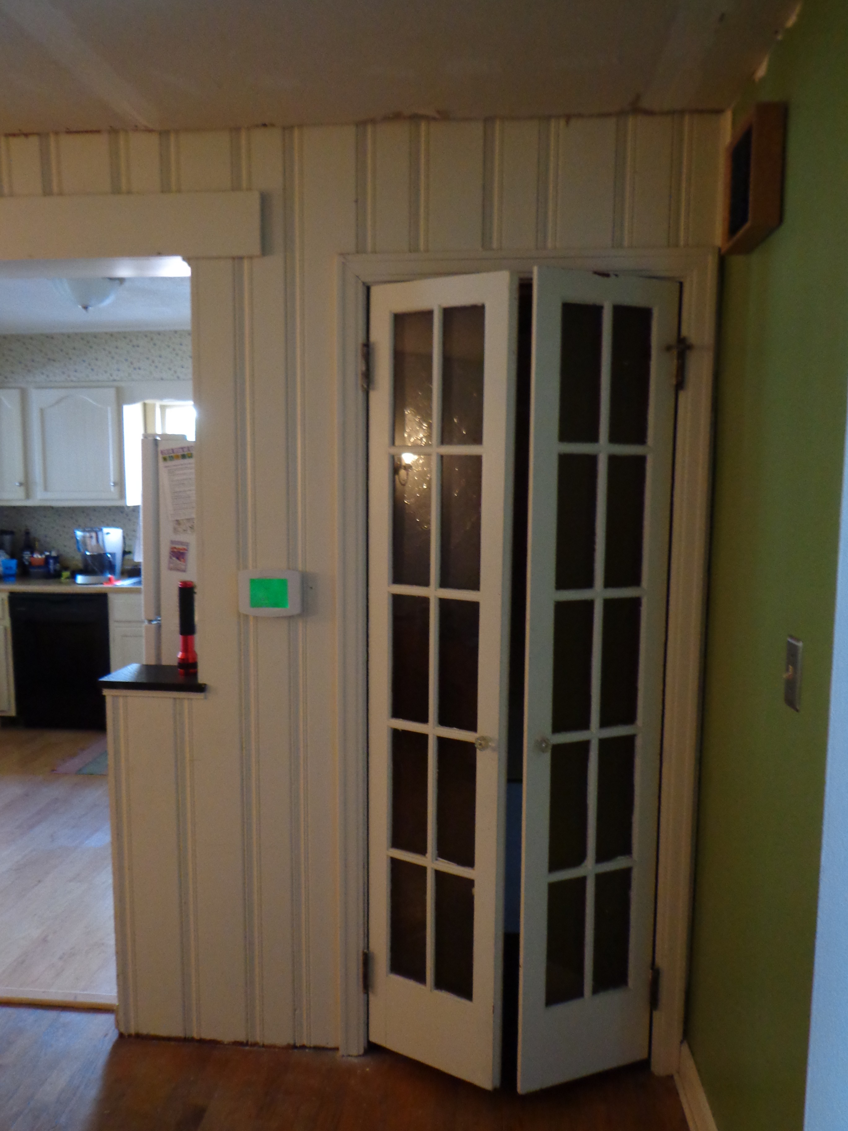 Unfortunately, it’s a decent size wall and I also have two doors to refinish, too. These are the doors that lead down to our basement. One of the panes of glass is cracked so we’ll have to change that out. I will also need to figure out some kind of curtain to go on them since I don’t want to walk by and be able to see down into the ugly basement through the glass. Currently there is a really ugly piece of brown plexiglass on it.
