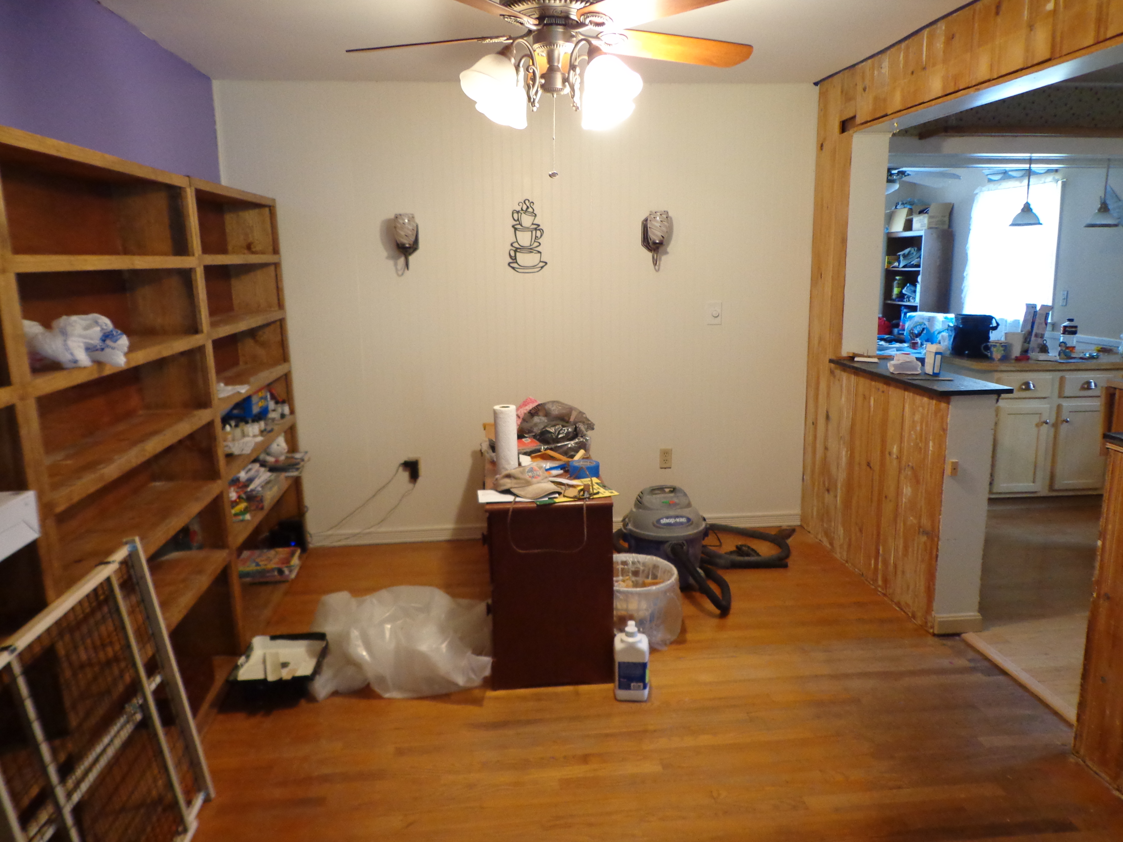 Here’s a bit of an idea what it will look like. Once I get all of the paint removed from the wall I am going to stain it to match the bookshelves. I thought that would be a nice balance to the room. I also repainted the back wall using the same off-white that I used in the dining room. I couldn’t strip that wall because it is one of those cheap pressboard panels.