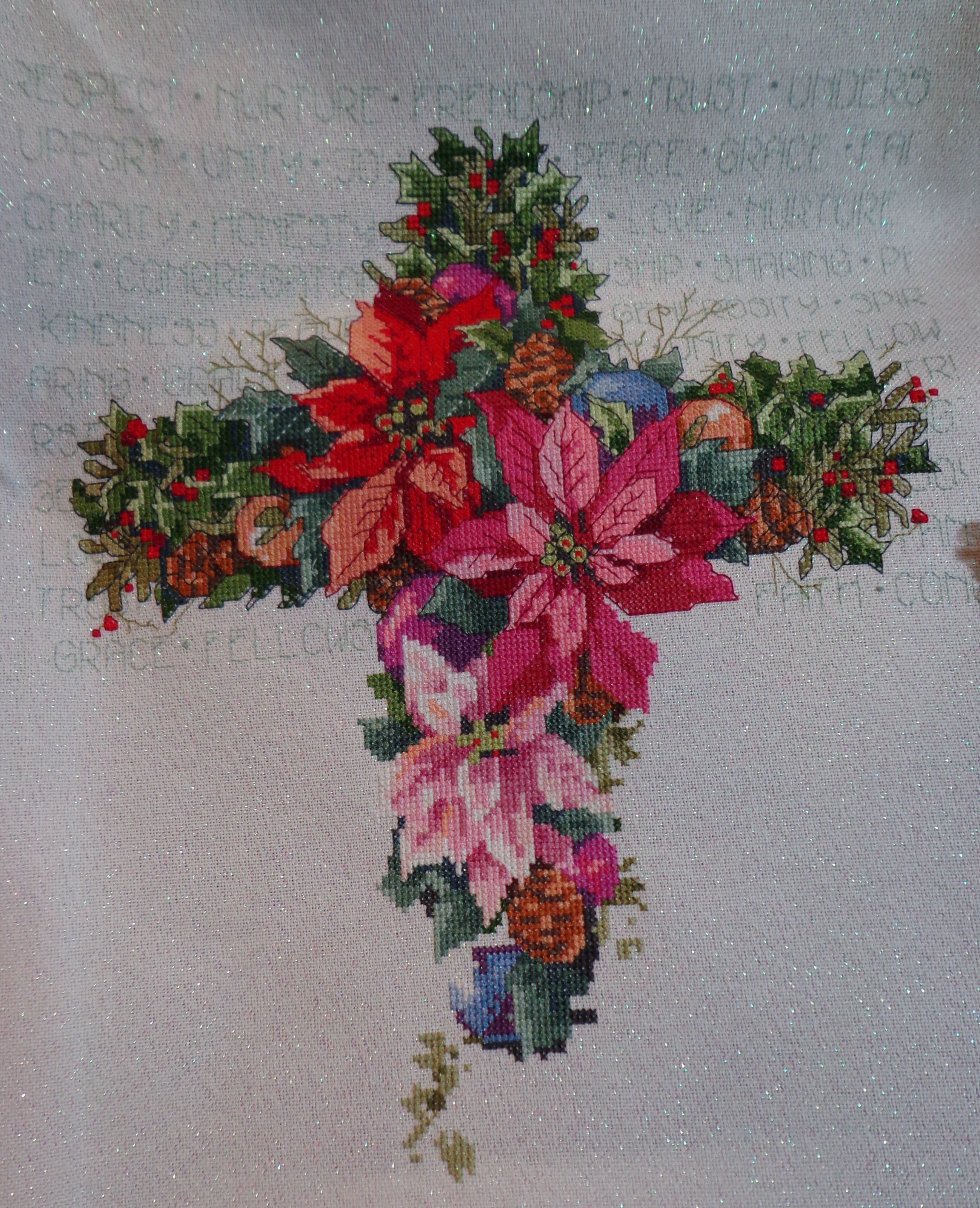 Well, it’s been another month of stitching and I feel like I’m not making any headway. This is how it looked at the end of October. I was starting to stitch the bottom part of the cross and that poinsettia was taking forever to finish!