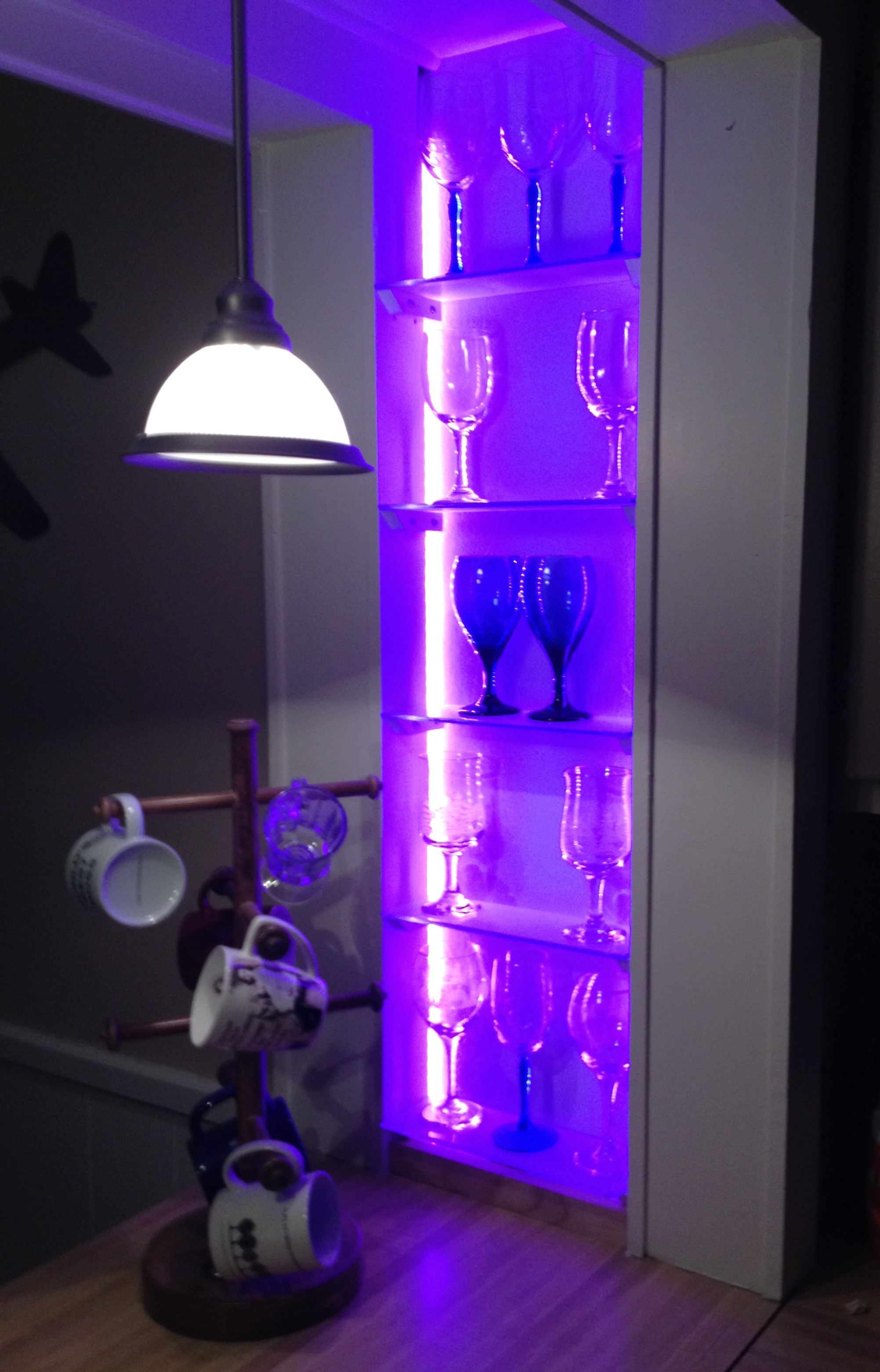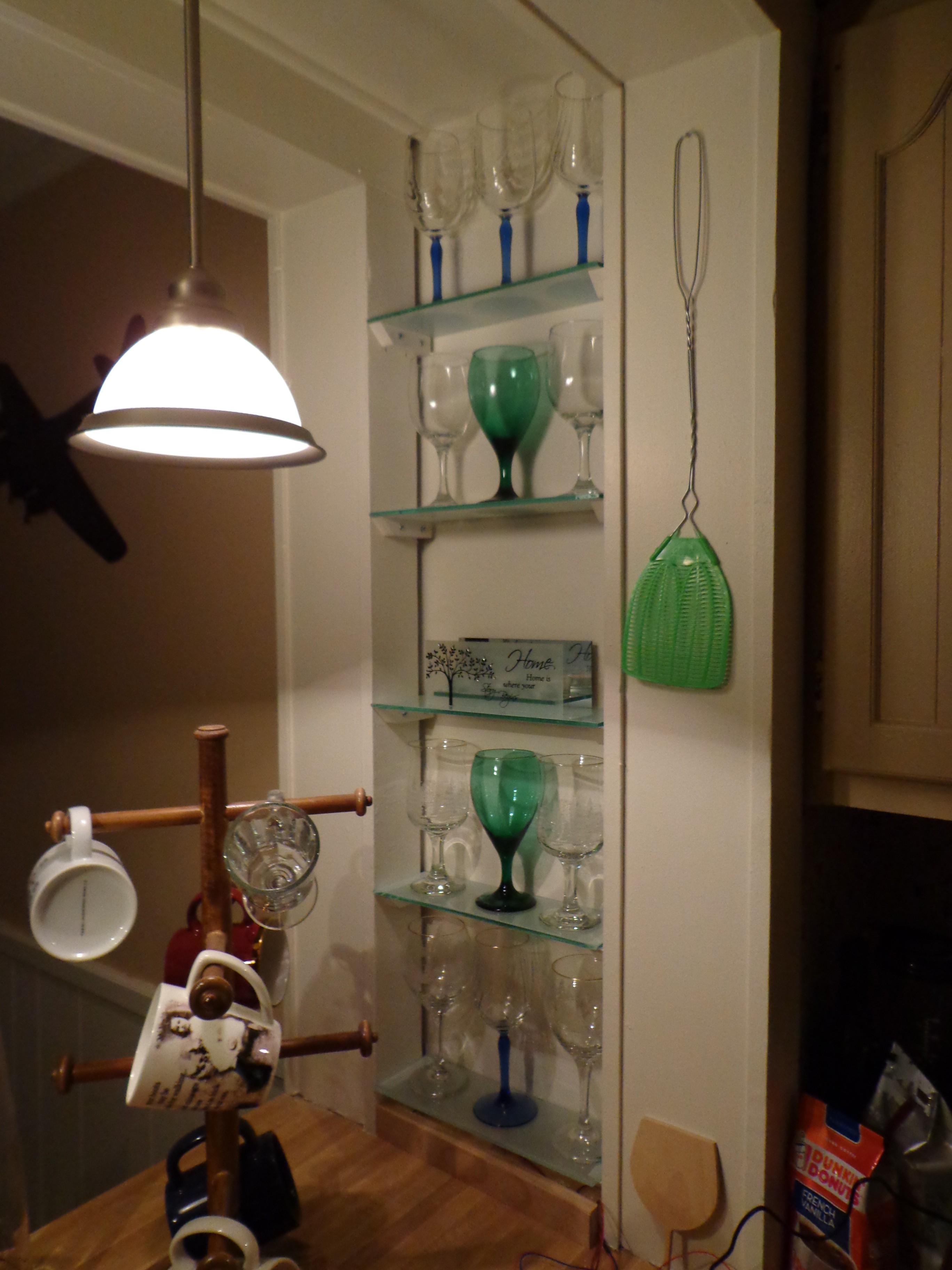 And this is how it looks at night when the LEDs are on. It really does have a neat effect. I’m sure that most people wouldn’t like it, but I think that it’s interesting. The stemware is really set off with the light, too. There’s still a little more tweaking to be done, but this is how the finished product will look. Isn’t it neat?