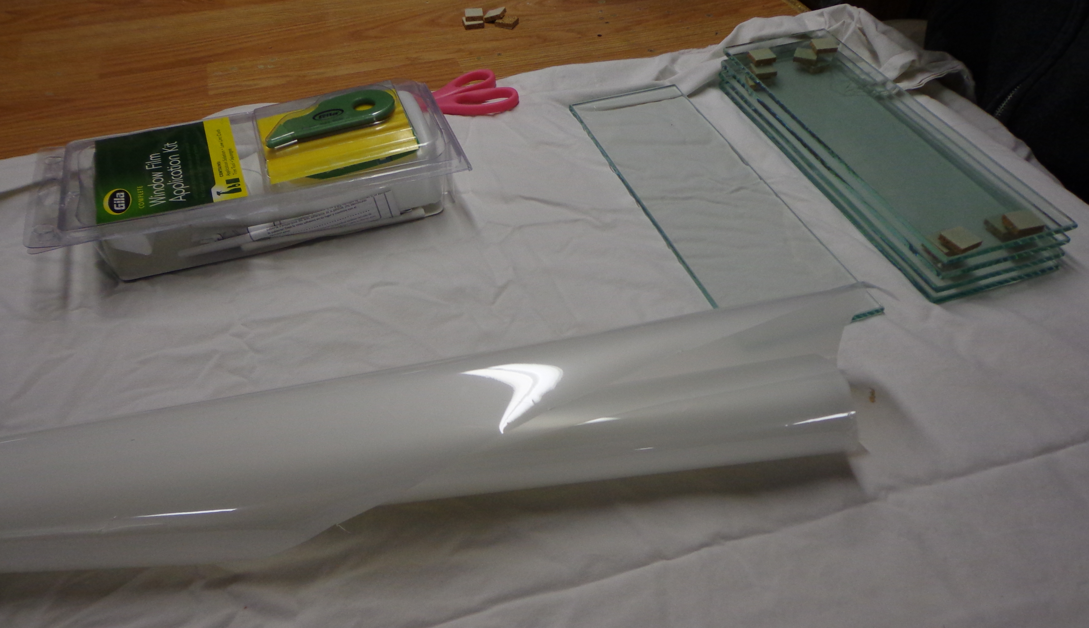 It’s a fairly easy process, once you figure out just how you want to do it. At first we tried wrapping the covering around the glass so that it was on both sides, but that didn’t work. Finally Jay decided that it would work best if we just put the wrapping on one side of the glass. It turns out that was a good idea and I like the look of it.