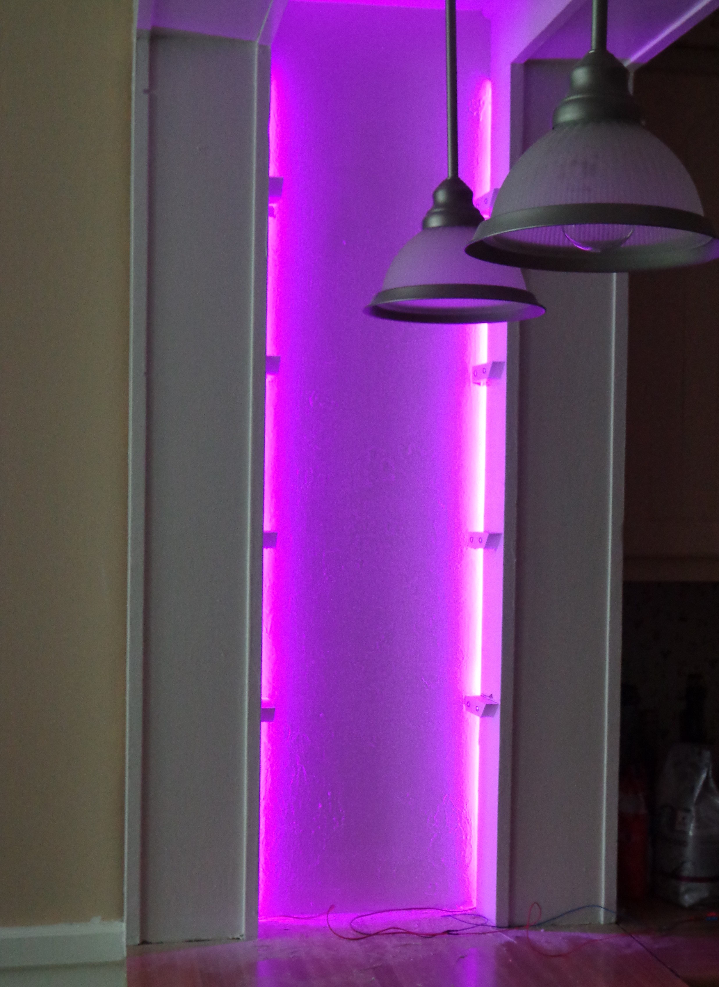 I was okay with using it as a light accent color, but I was afraid that we wouldn’t be able to get the paint just right and that I would end up really disliking it. I told Jay that I would be okay if he used some purple LEDs and sort of back-lit it. Jay said that he couldn’t do that, etc. I left him to figure it out because I had other things that I needed to do. As I was sorting piano music he called me into the kitchen.