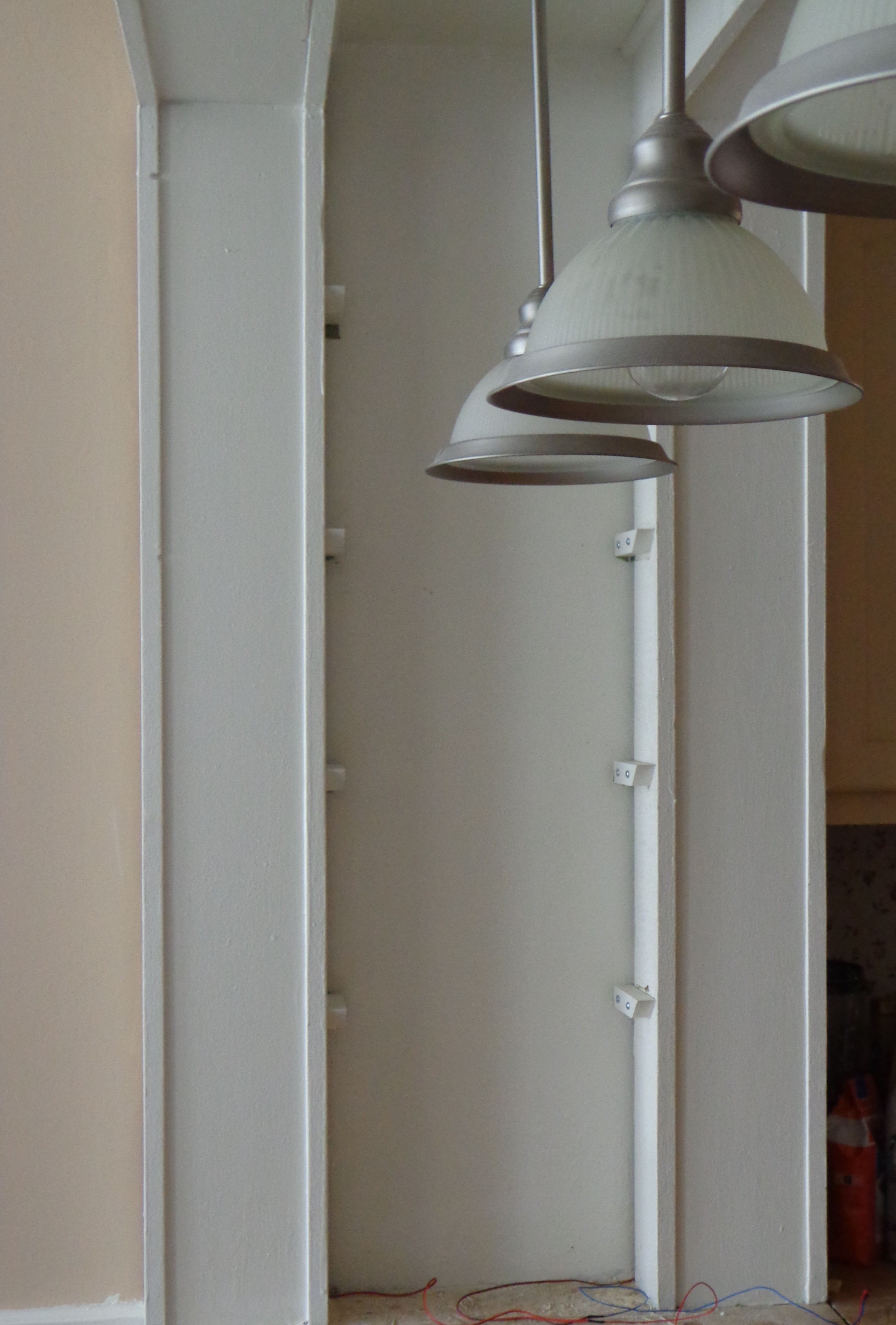 Despite the fact that we started the dining room remodel in August, we are still working on little details here and there. The latest detail to be added is our set of stemware shelves. This picture is from when we first bought the house. If you look over to the left of the cupboards, between the kitchen and dining room, you can see the white shelves that are kind of inset in the wall. These were wooden and so when I repainted the trim in the dining room I decided to repaint the shelves, too. Except, the more that I looked at it the more I thought that frosted glass shelves would look great to accent the frosted glass shades of the light fixtures right next to them.