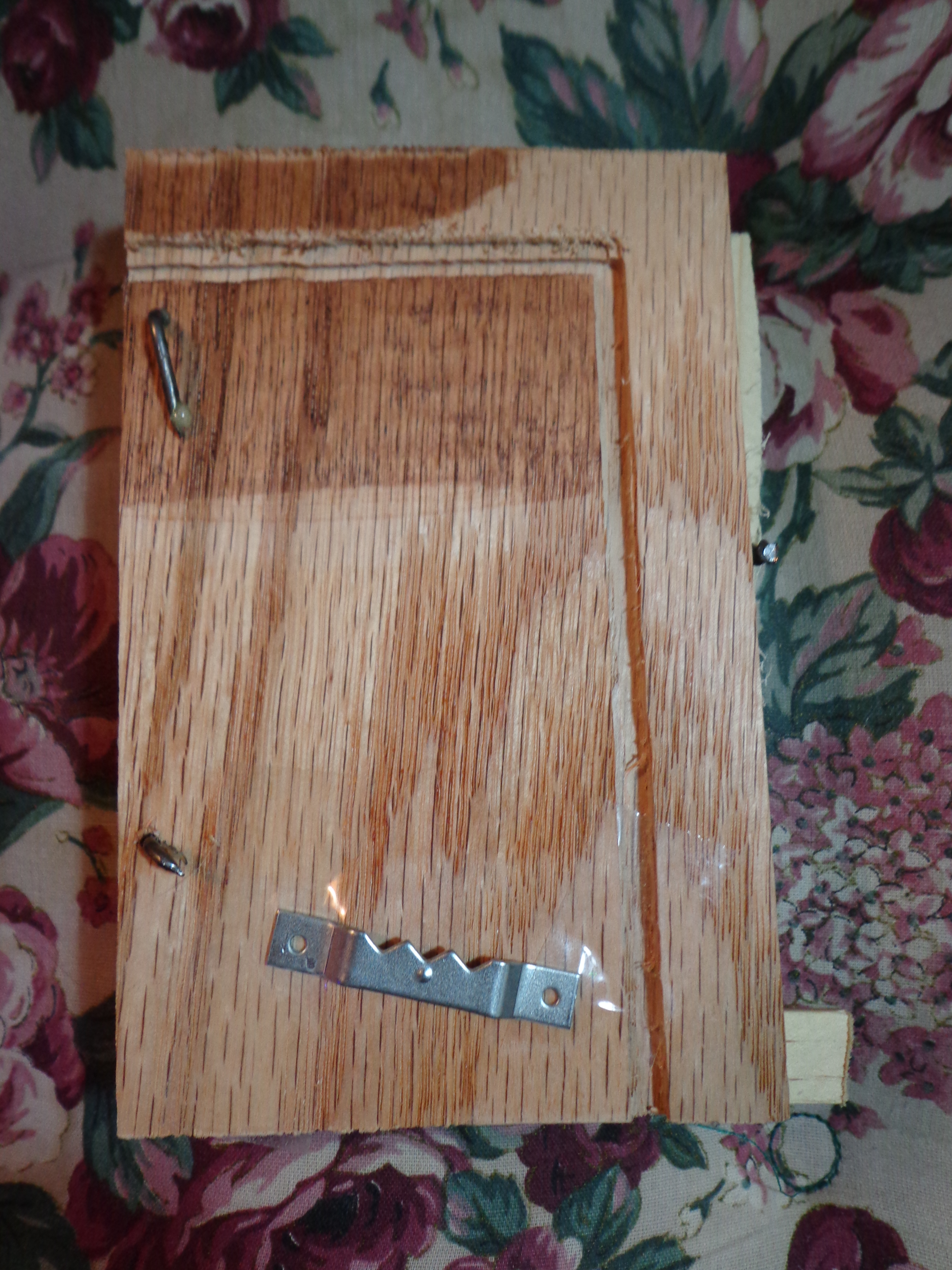 This is the back. I told you had I had used a piece of scrap wood that Jay had started to cut something out, but had to stop and readjust something. Then I used it to see what color of stain I liked best for Pauline’s box. When I was experimenting with the Modge Podge I had just flipped the board over so that I would have a flat surface. Jay cut the end of the screw and one of the nails off so that they wouldn’t be poking out. But I think that the topping on this cake is the picture hanger… upside down… and taped on. LOL.
