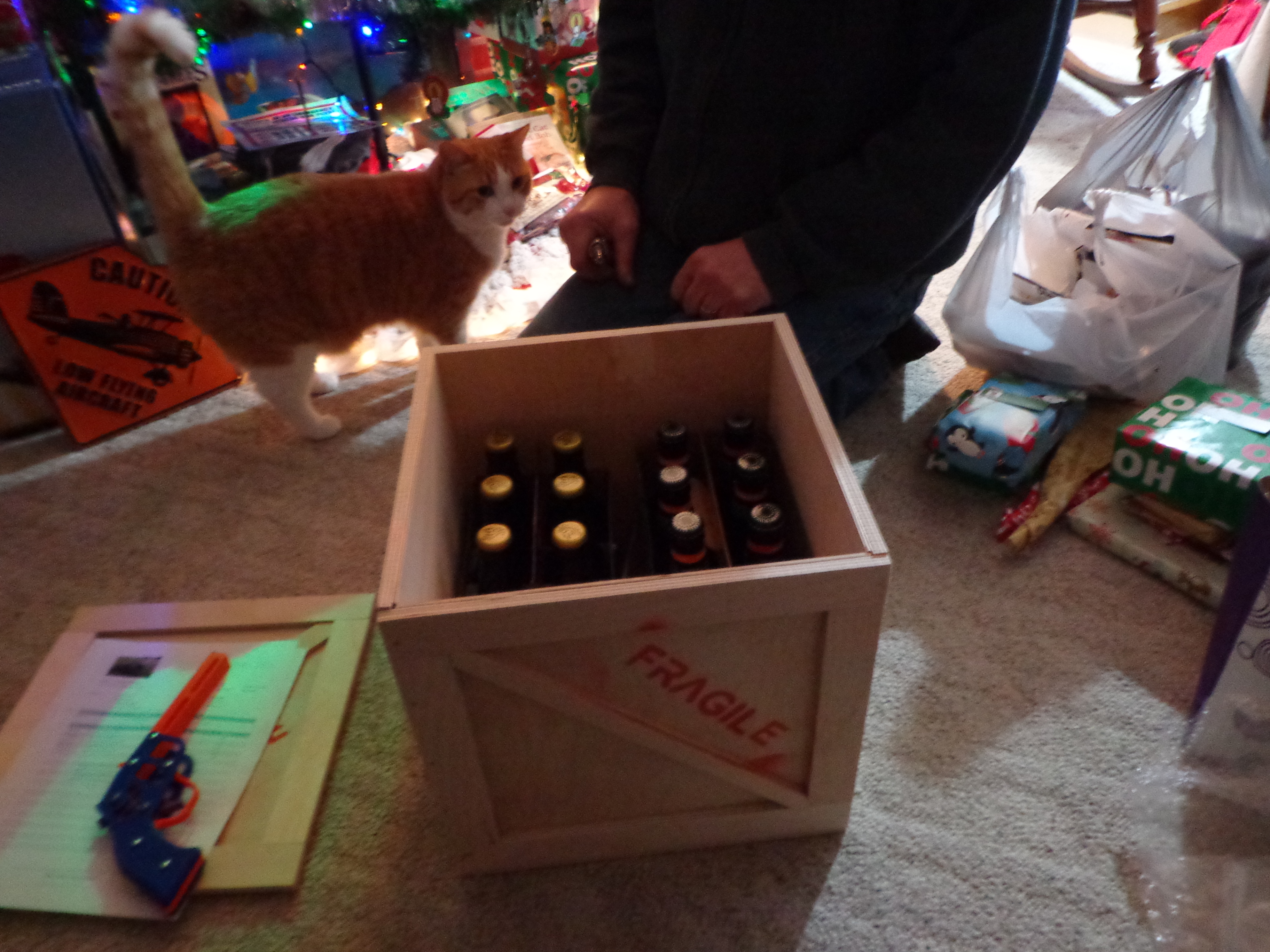 For Chuk we placed two six-packs of beer that he likes plus a rubber band gun that Jay had 3D printed. These crates were sturdy enough to handle that kind of weight. I believe that they were about a foot square.
