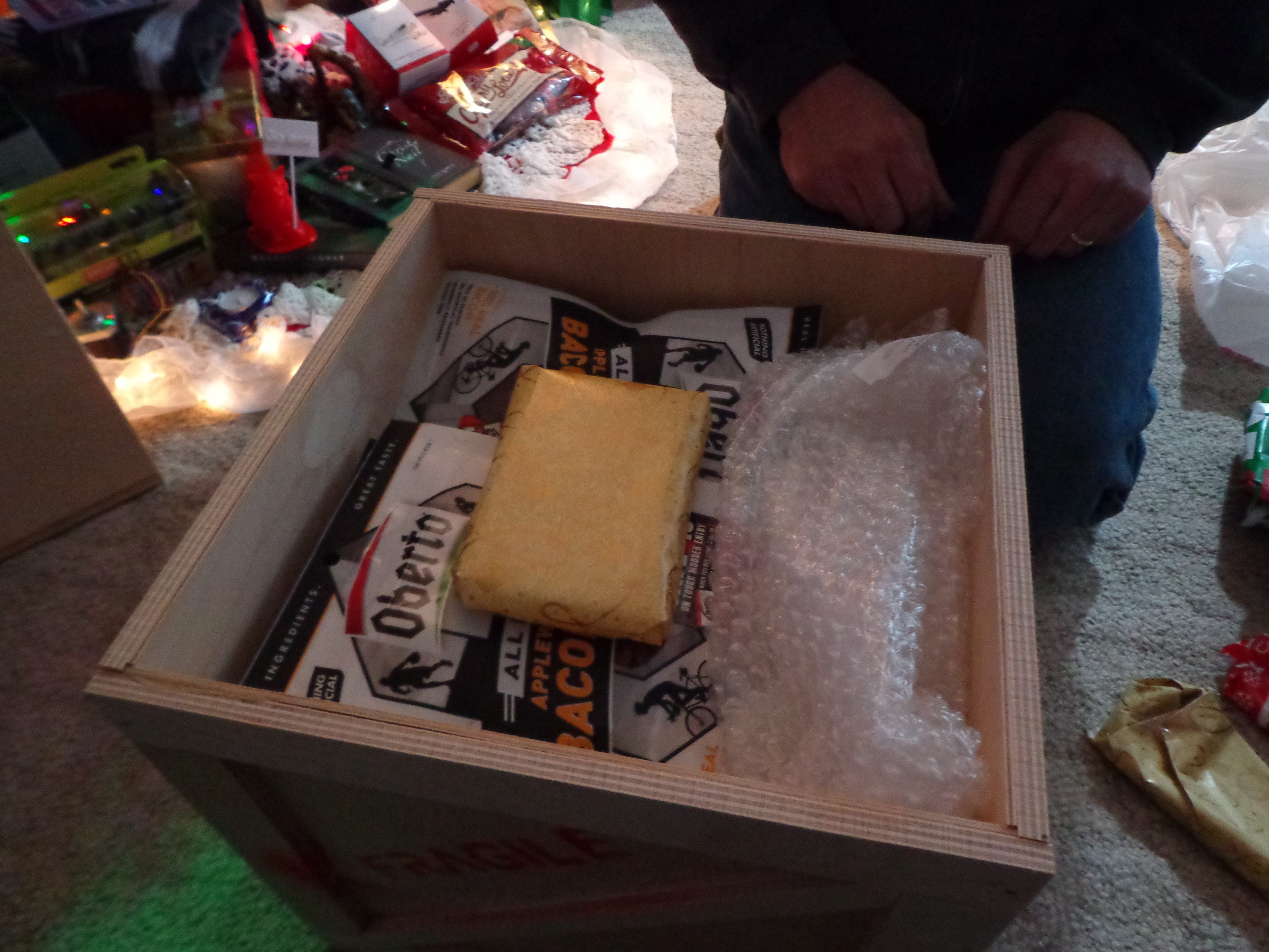 Now, for this next gift I have to admit that I stole the idea and twisted it a bit to make it my own. I had heard about this site where you can order crates of stuff for the men in your life. It arrives in a crate, with a crowbar, and the guy gets to use the crowbar to open it and then enjoy all of the fun stuff inside. I looked at the site to see if I could find something for my dad. Unfortunately, I didn’t see anything that my dad would really enjoy. I was showing Jay the site and telling him that I didn’t know what to do for my dad when he said that he could build a crate for me.