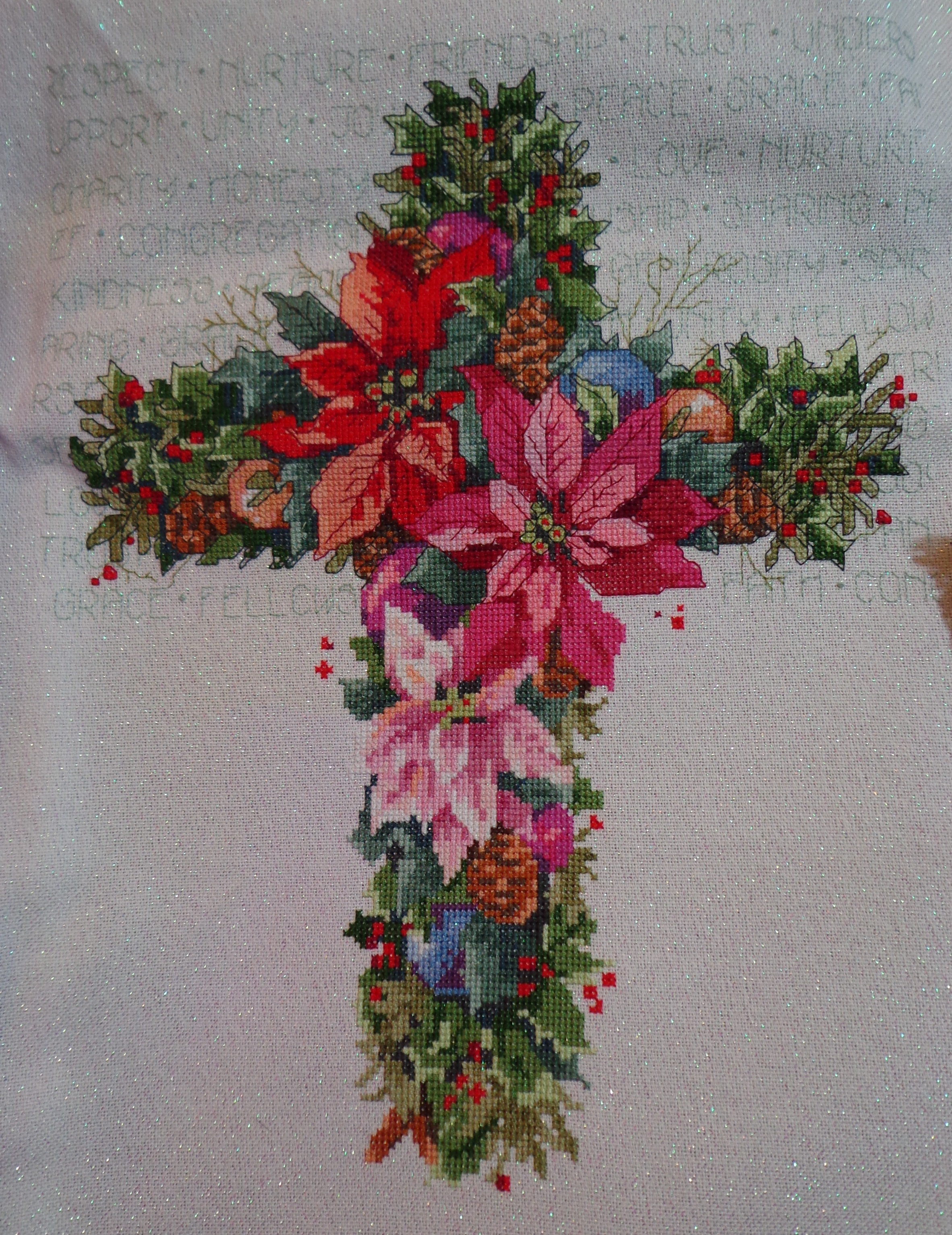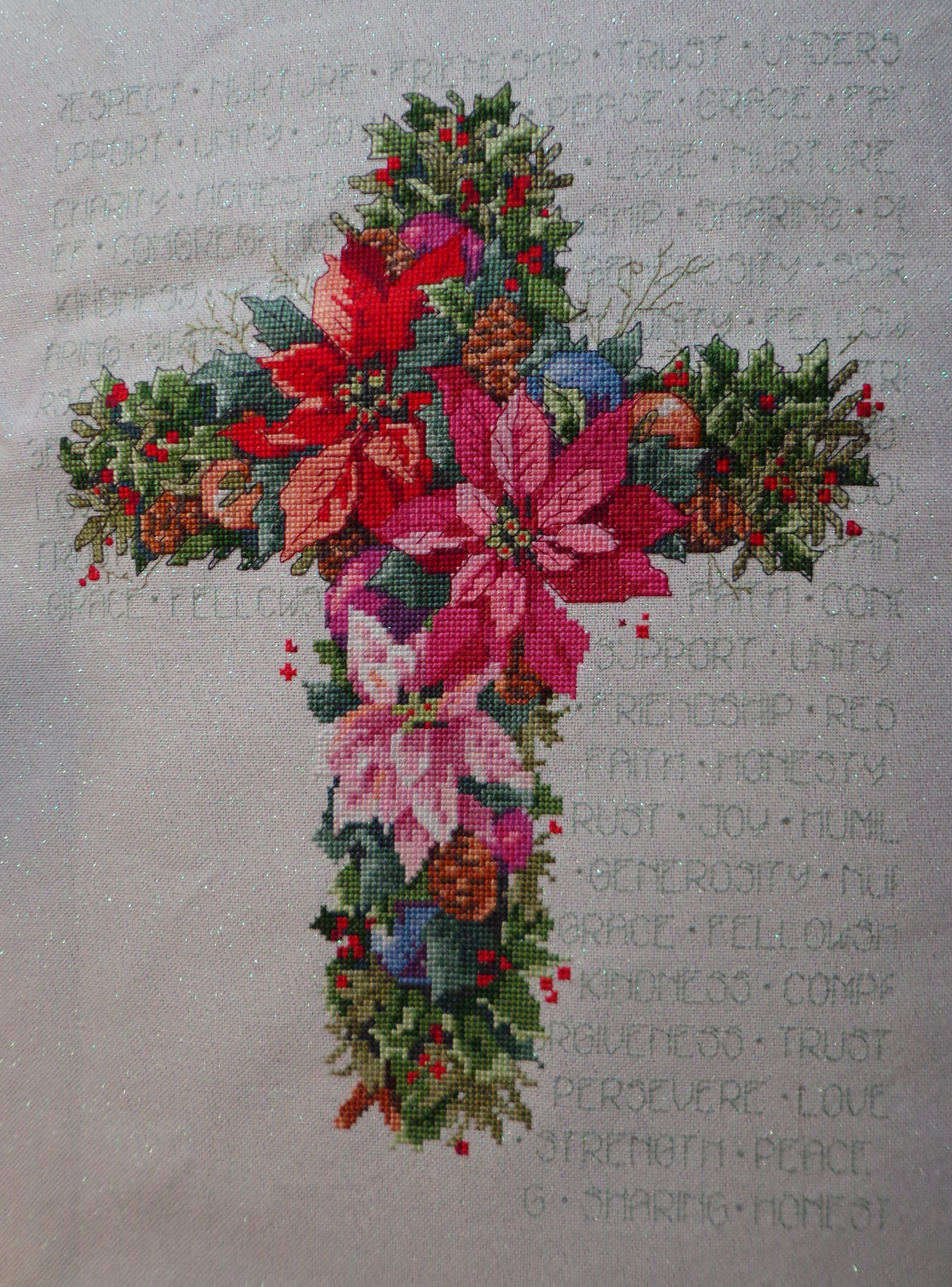 At the end of December this is where I was at. I had just started to stitch the words that run along the bottom right side of the cross.