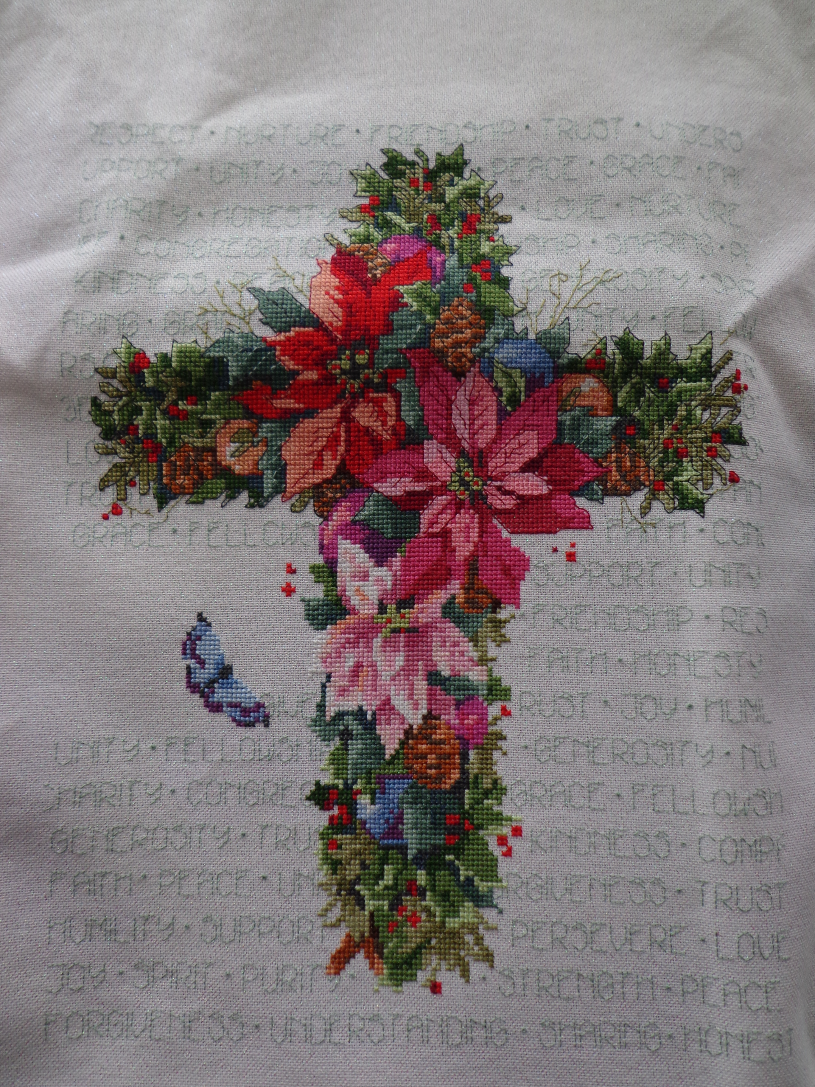 The text is finished! All that remains is to finish outlining the bottom half of the cross, the butterfly, and various little viney things coming off of the bottom part of the cross. I also have to decide if I want to stitch in the randomly placed French knots that I think serve as berries or something. French knots are hard to do when they are out in the middle of nowhere, though, with nothing to anchor the thread behind.