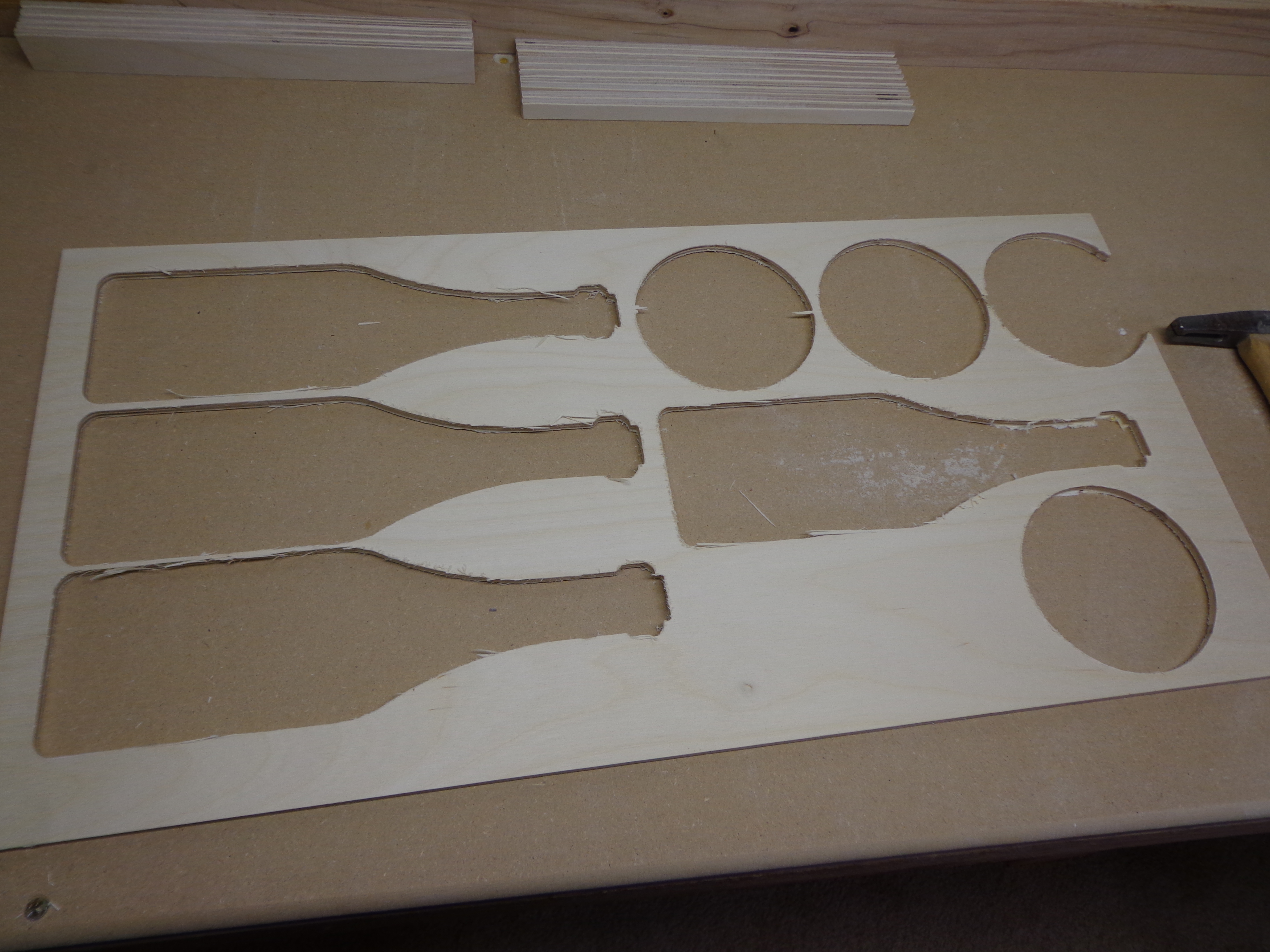 As he was cutting out the supports he had the idea of cutting out extras and make them into coasters. I liked the idea, but then said that we needed to make a wine bottle-shaped holder for them. This led down a very busy path for both of us.