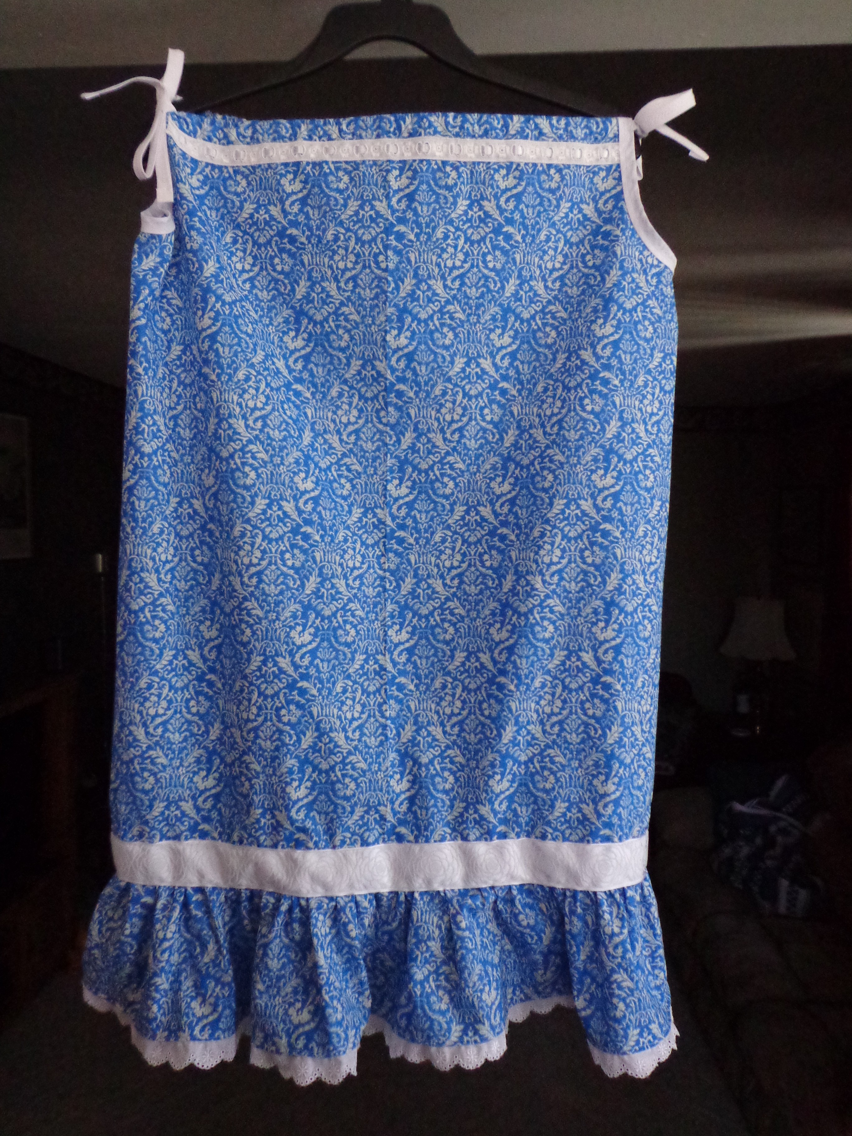 First off, it was darling. Secondly, it matches the light lavender lace that I used on the hem. The blue material at the bottom has a light lavender color running through it, plus there are a lot of dark purple flowers on the main body of the dress. Oh, and the main body has a checkered kind of pattern running through the background, as does the ribbon. It’s lacey and it’s purple. Some little girl is going to love it!
