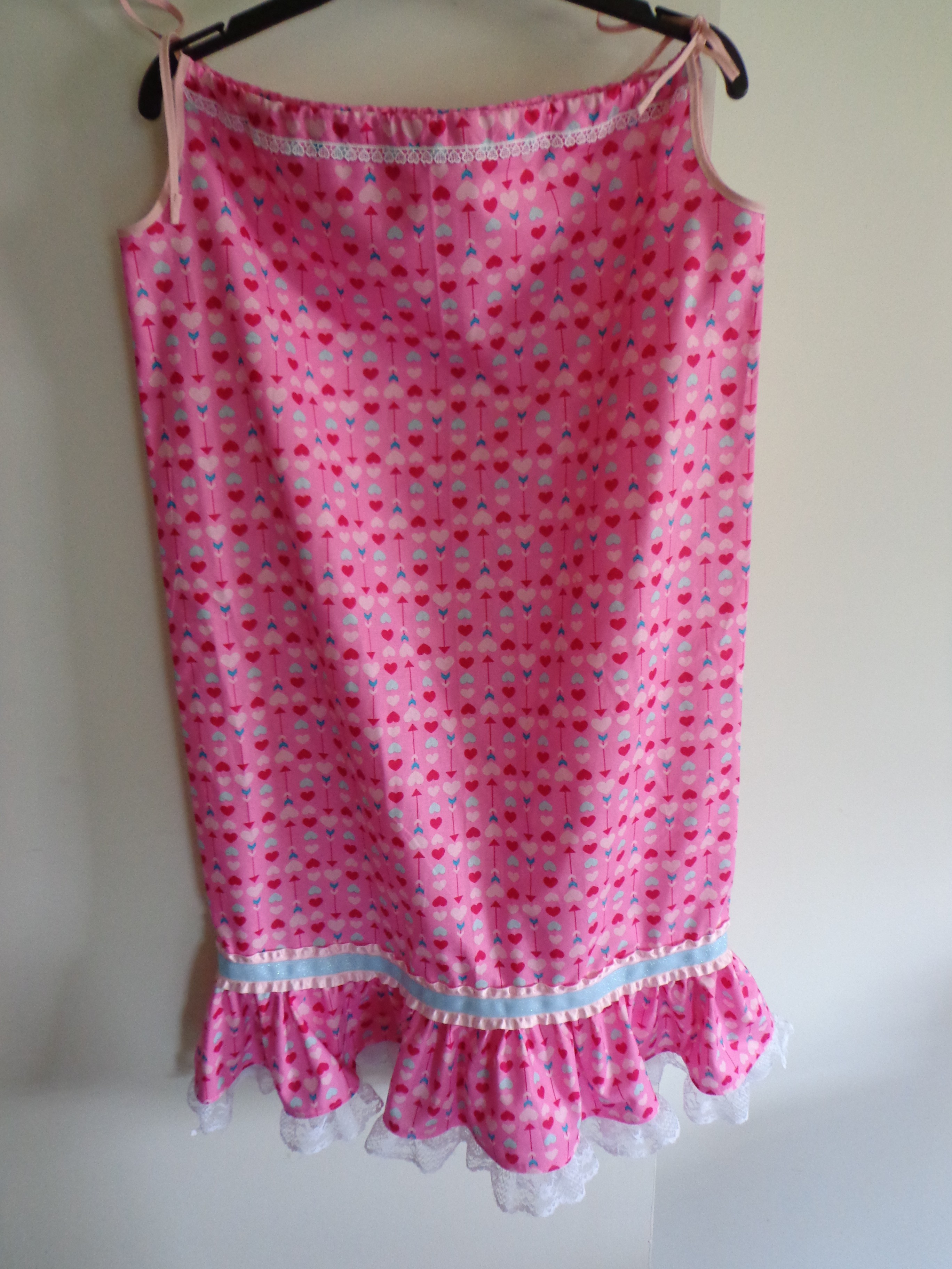 I found some pretty, sparkly blue ribbon that matched the blue hearts and then I had some heart lace trim that I used along the neckline. The ribbon is my favorite part of this one.