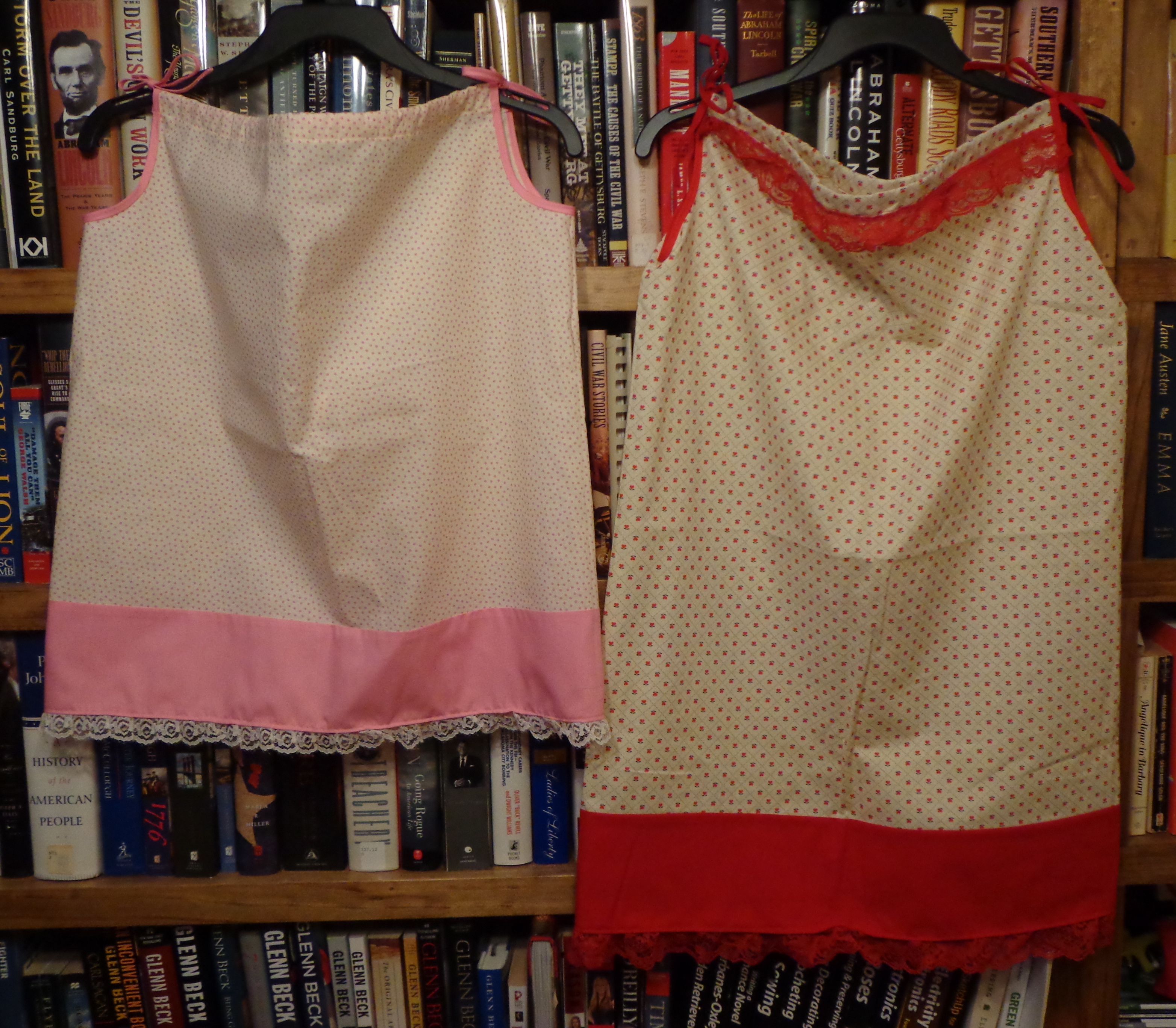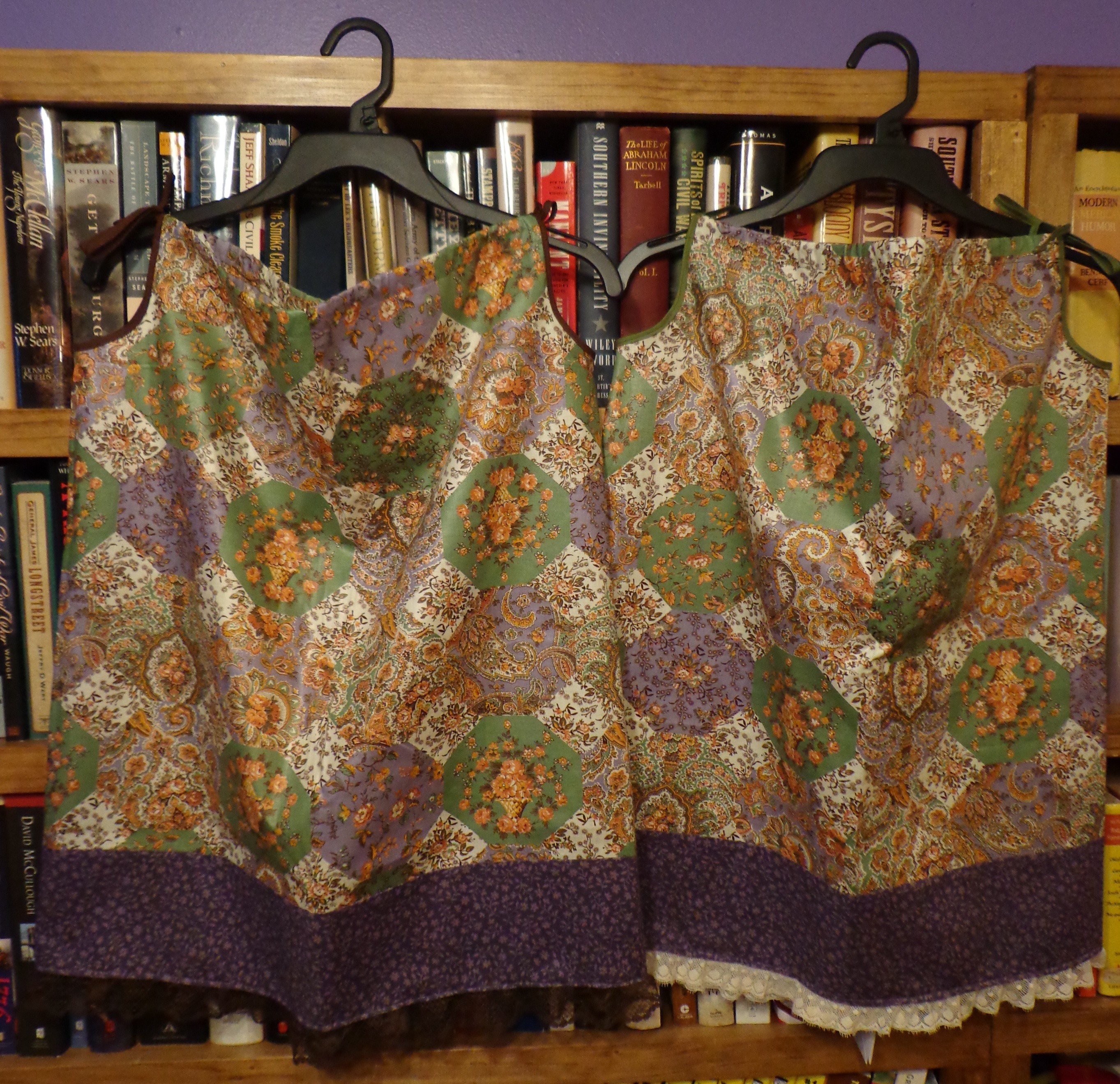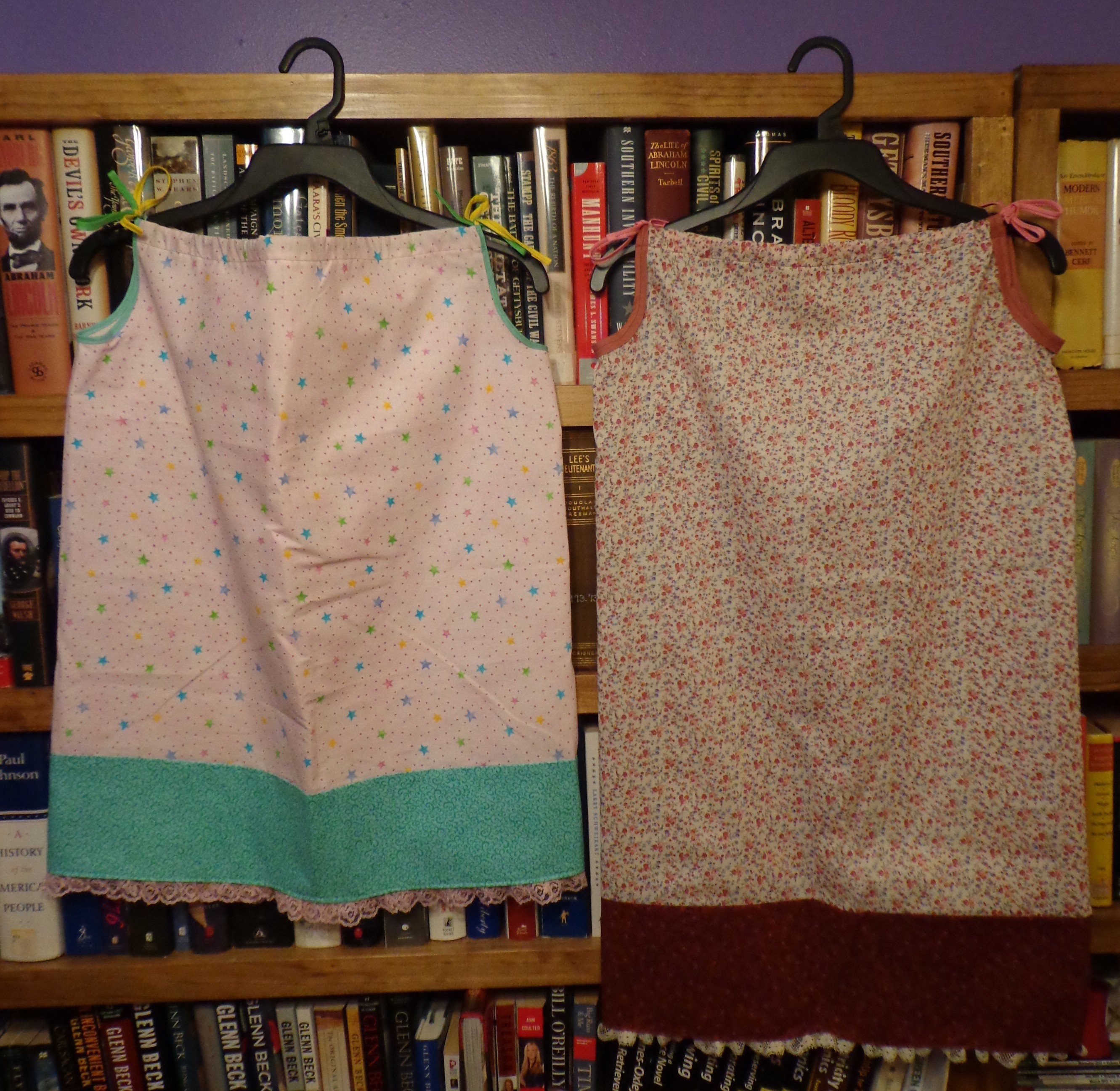 These two were made exactly the same, so I took great pleasure in making them different. The dress on the left was trimmed in brown and I used a brown lace on the bottom. The dress on the right has an olive green trim and ties, and then a thicker knit lace on the bottom.