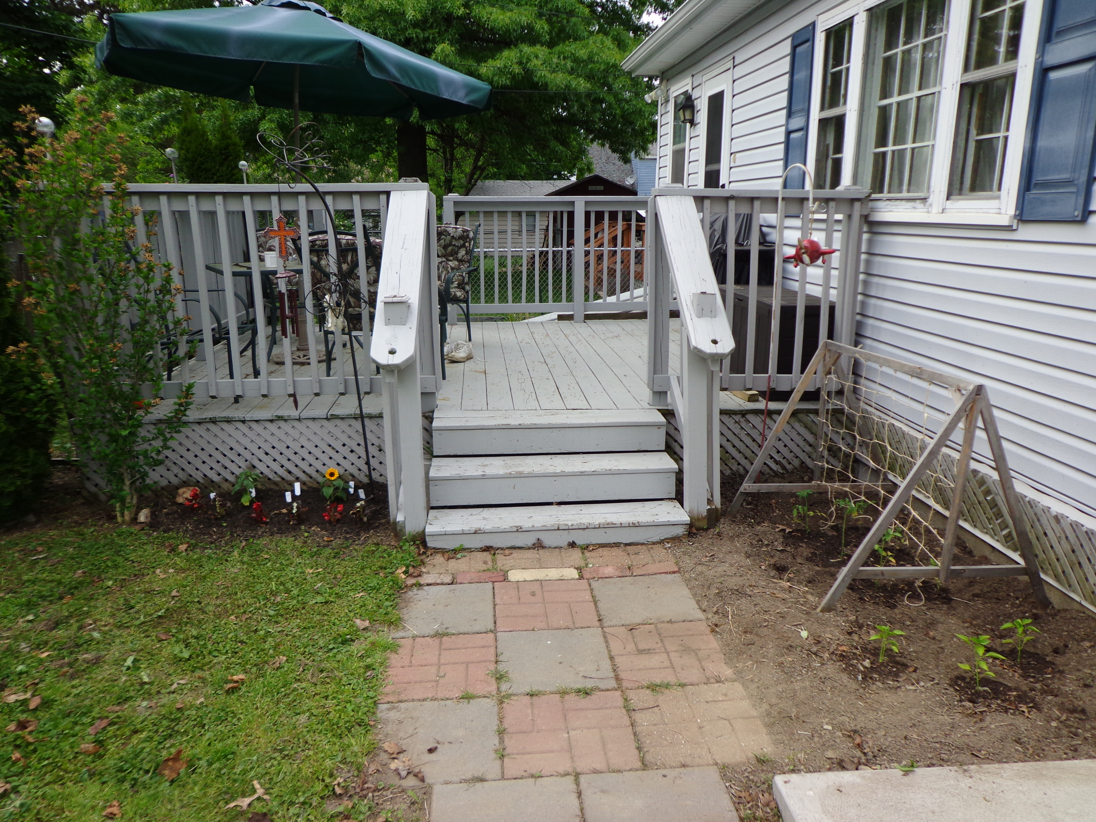 Doesn’t that look so much better?? It didn’t take too much of an effort to tear the shrubs out. I replanted the littlest one next to my fence and then the other three I put on the corner with a ‘FREE’ sign. I just noticed the other day that one of the people on the next block over had taken them and planted them in their yard. They are a little worse-for-wear, but I think that if the people take care of them that they will come back. Anyway, I really love that we have these shrubs gone now. Except, it showed us that we have something else to fix. You can see that horrible piece of lattice on the house that is covering up where the deck used to extend. It’s the only reason that I could come up with as to why the J-channel would be placed like that. Before Fall Jay and I will have to rip this apart and fix it properly. I think that this might be where some of the critters are getting into our house (Bob brought one up to us Sunday night…)