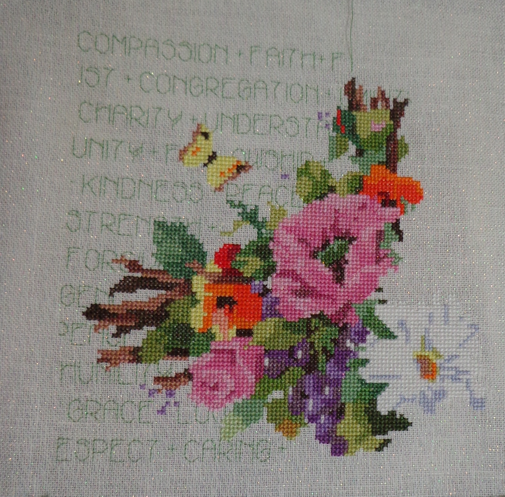 And now this is how it looks after I got all of the words stitched in around the cross. At least, this portion of the cross. I’m going to stitch a few more letters in the word ‘Friendship’ at the very top, but then I will start the outlining. I can’t wait! That’s when this will REALLY start to pop!