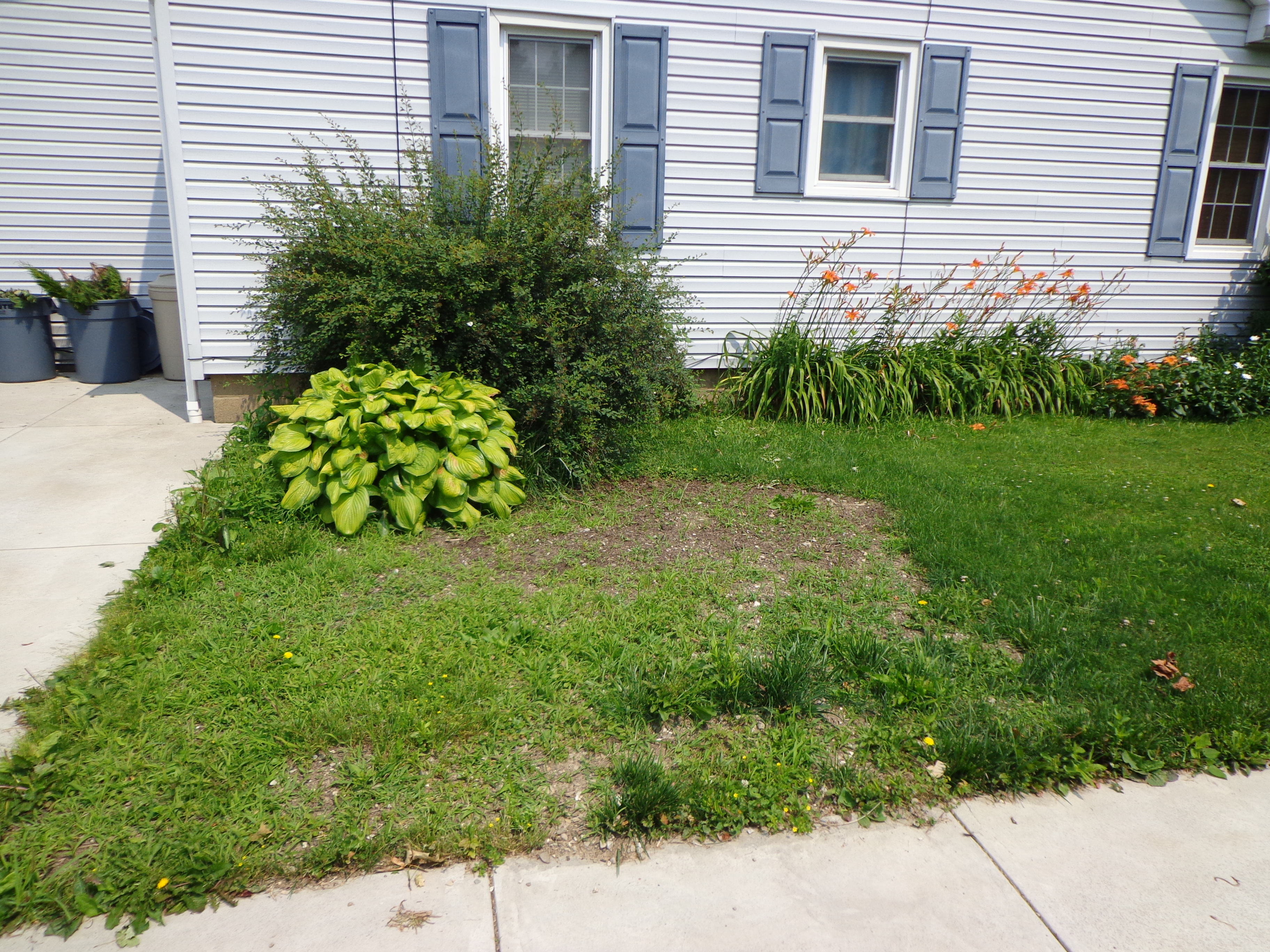 I ended up transplanting the hosta and moving it to the other side of the house. Then I didn’t know what else to do with that spot. If you notice the stupid weeds grow up and start spreading over the driveway. That’s right where I park and even if Jay has just mowed and weed-wacked it’s not very long before I’m stepping on the weeds again. That really tends to irritate the snot out of me. Jay and I discussed what to do with this area (even though he claims that he doesn’t remember the conversation at all).