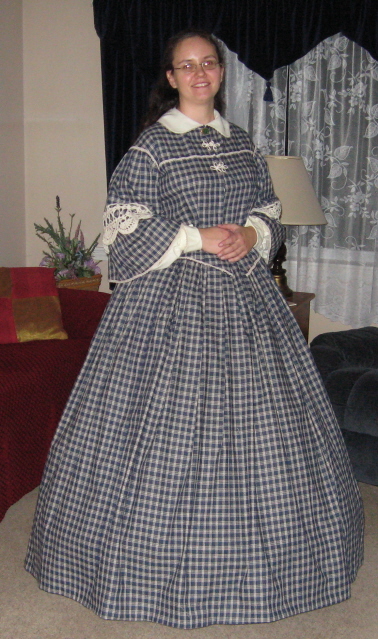 This particular pattern was simple enough for me to sew and fancy enough to be able to wear as a visiting dress. This is really what I would have worn as a reenactor if I had gone out for the day to an event. The previous dress would have been worn if I was actually camping out and having to do manual labor in camp.