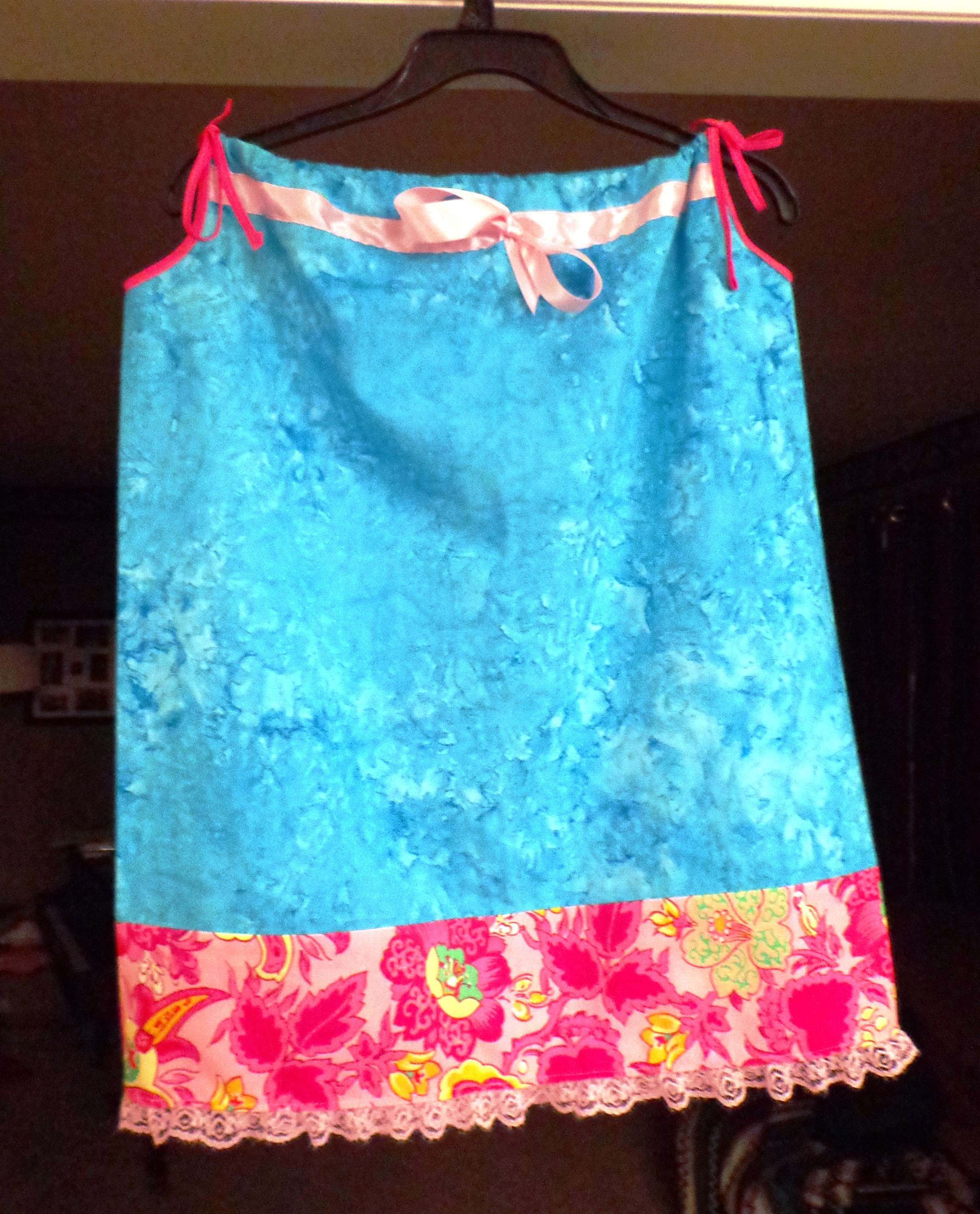 This one was a fun dress to trim. I used the bright pink for the arms and ties, and then a soft pink around the hem. I was tired of using lace at the neckline, though, and wanted something different. I had this silky pink ribbon so I sewed it on and then tied it. I think that it turned out really cute!