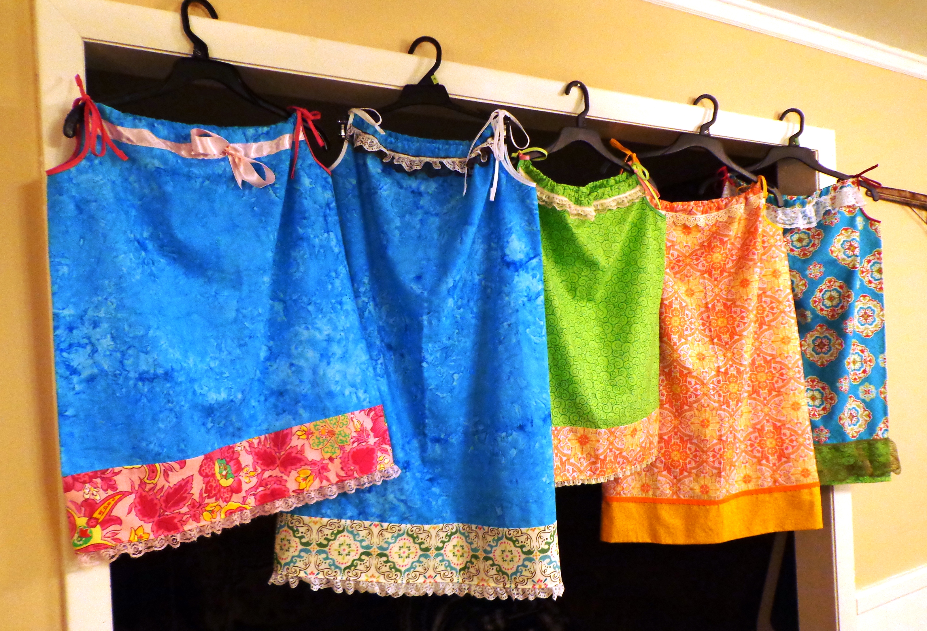 This is what the dress blanks look like when I get them. I have to cut the arm holes in them, trim the edges, sew the pockets for the ties, and then dress it up with lace and/or ribbons.