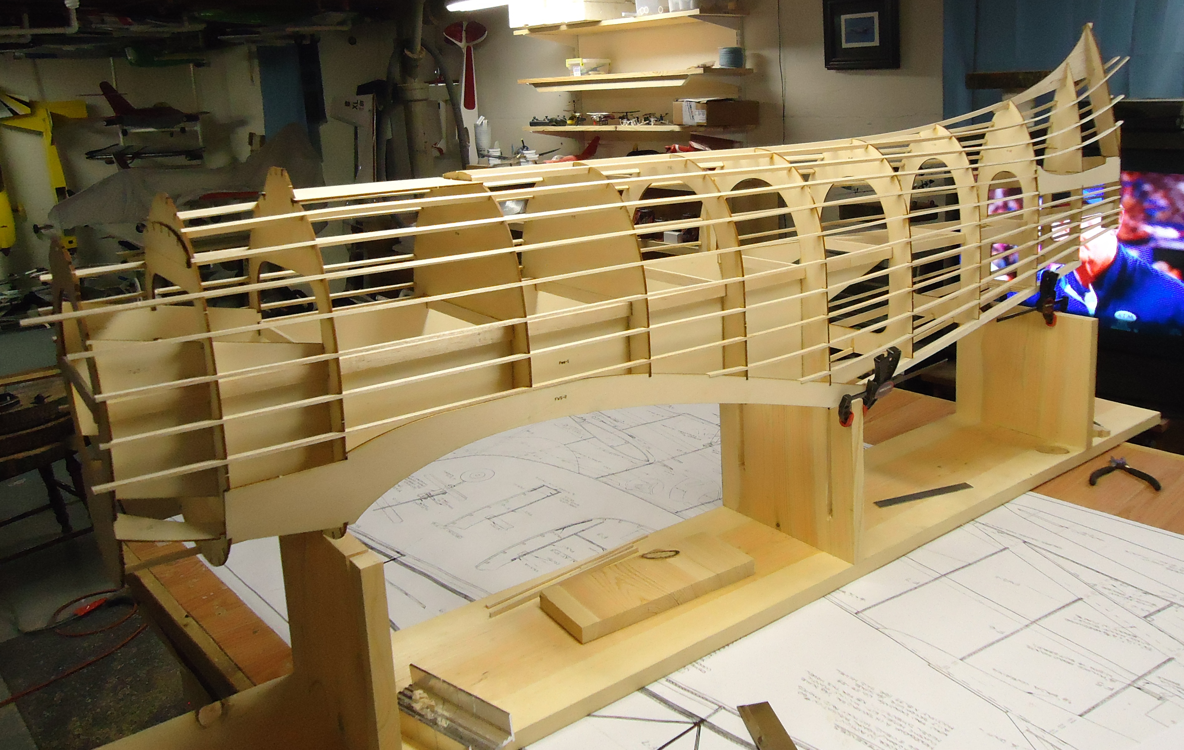 Then you begin to attach the stringers and other pieces of side wood so that the fuselage will begin to resemble a giant worm with a big mouth.