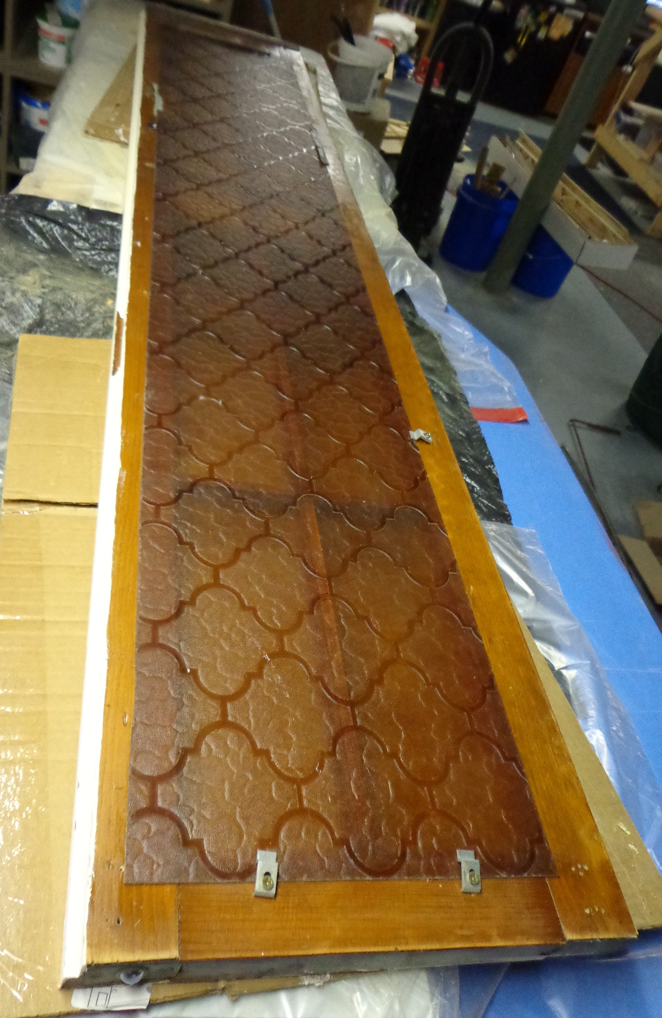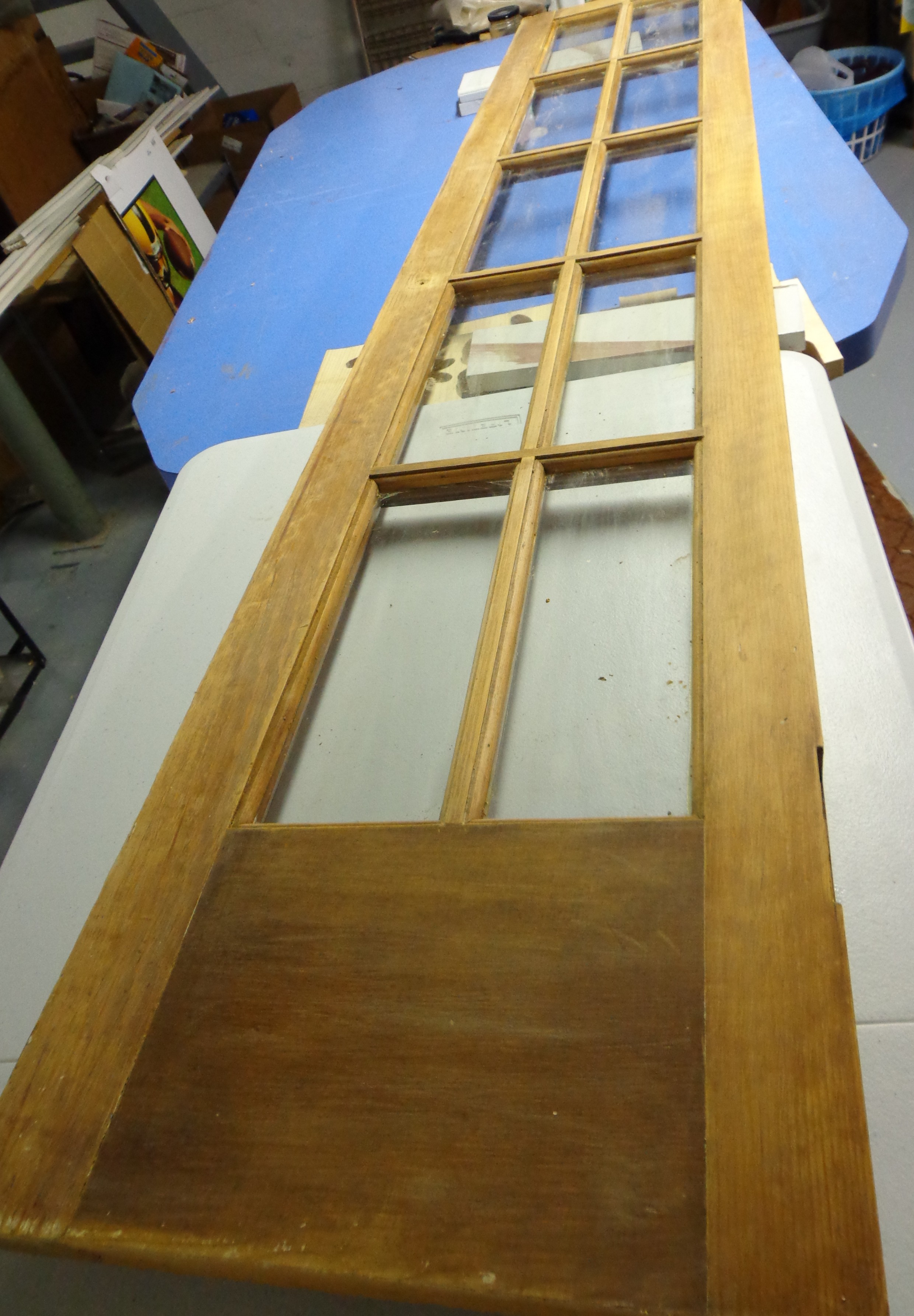 What was so time consuming was that once I had finished one side, I had to flip it over and do the same thing on the other side. So each door requires me to apply stripper four times. Then I have stain to apply to each side. Then I applied three or four coats of poly to each side, allowing each coat to dry for about 24 hours. Finally, it took me about 8 hours to clean up the panes of glass and put the privacy film in place. Jay is going to clean up the hardware for me before we hang these back up.