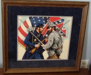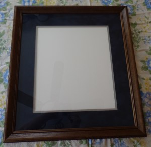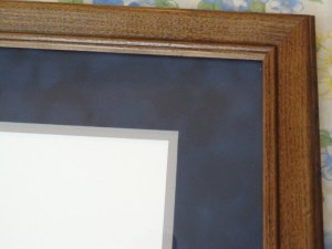 I chose a medium gray inner mat, a blue suede top mat, and an oak frame that reminds me of the butt of an 1861 Springfield rifle.
