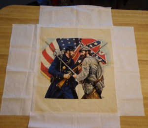 I washed and ironed it, then let it dry. The frame is quite a bit larger than this piece, so I had to sew fabric onto the sides. This allows me to lace the piece around foam core with plenty of material to spare.