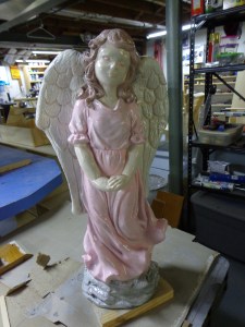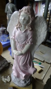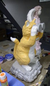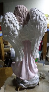 I also wanted a soft look to it. I think that I had grabbed a watered-down bottle of white acrylic off of Jay’s shelf, so when I mixed it with the other colors to tone them down a bit it ended up give the paint more of a washed-out look when I painted the statue. As I did it I realized that I liked the look. It reminds me of those pictures you see that were taken in black and white, then were colored in later.