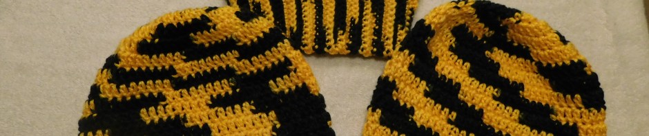 I was looking around and found that Premier Yarns has a worsted acrylic yarn with color combinations to fit various sports teams. For Christmas I wanted to make a hat for a friend using his favorite team’s colors. Premier currently has this on sale. You get five skeins of yarn for $10. So technically one of these hats will be used as a Christmas gift for that friend. I made the others because it’s a fairly popular team in this area so I knew some of the guys in the program would also be big fans.